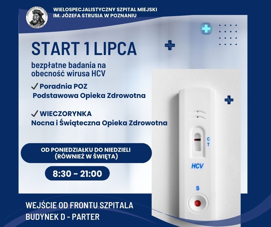 Codziennie od 8:30 do 21:00, bez umawiania, zapraszamy na bezpłatne badania przesiewowe na obecność wirusa HCV w Podstawowej Opiece Zdrowotnej (POZ) oraz Świątecznej i Wieczorowej Pomocy Doraźnej.