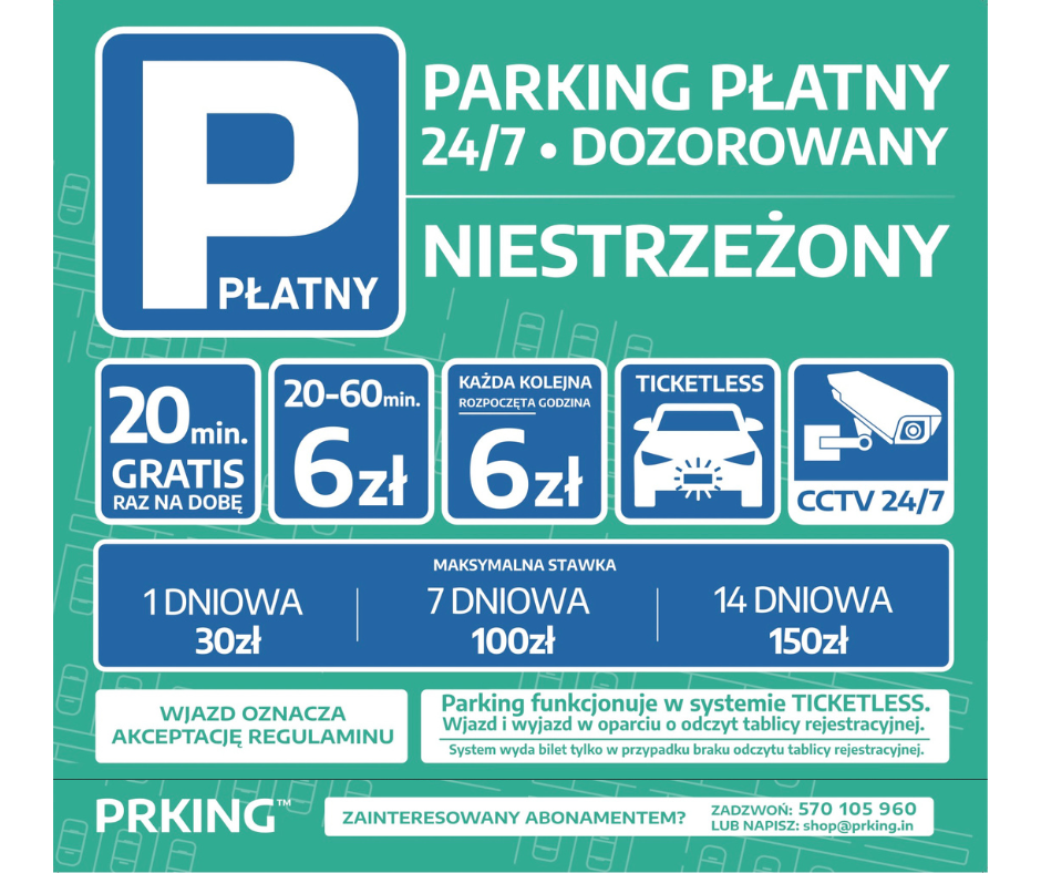 Prosimy o dokładne zapoznanie się z nowymi zasadami i regulaminem parkingu oraz o przestrzeganie ich w celu uniknięcia dodatkowych opłat.
