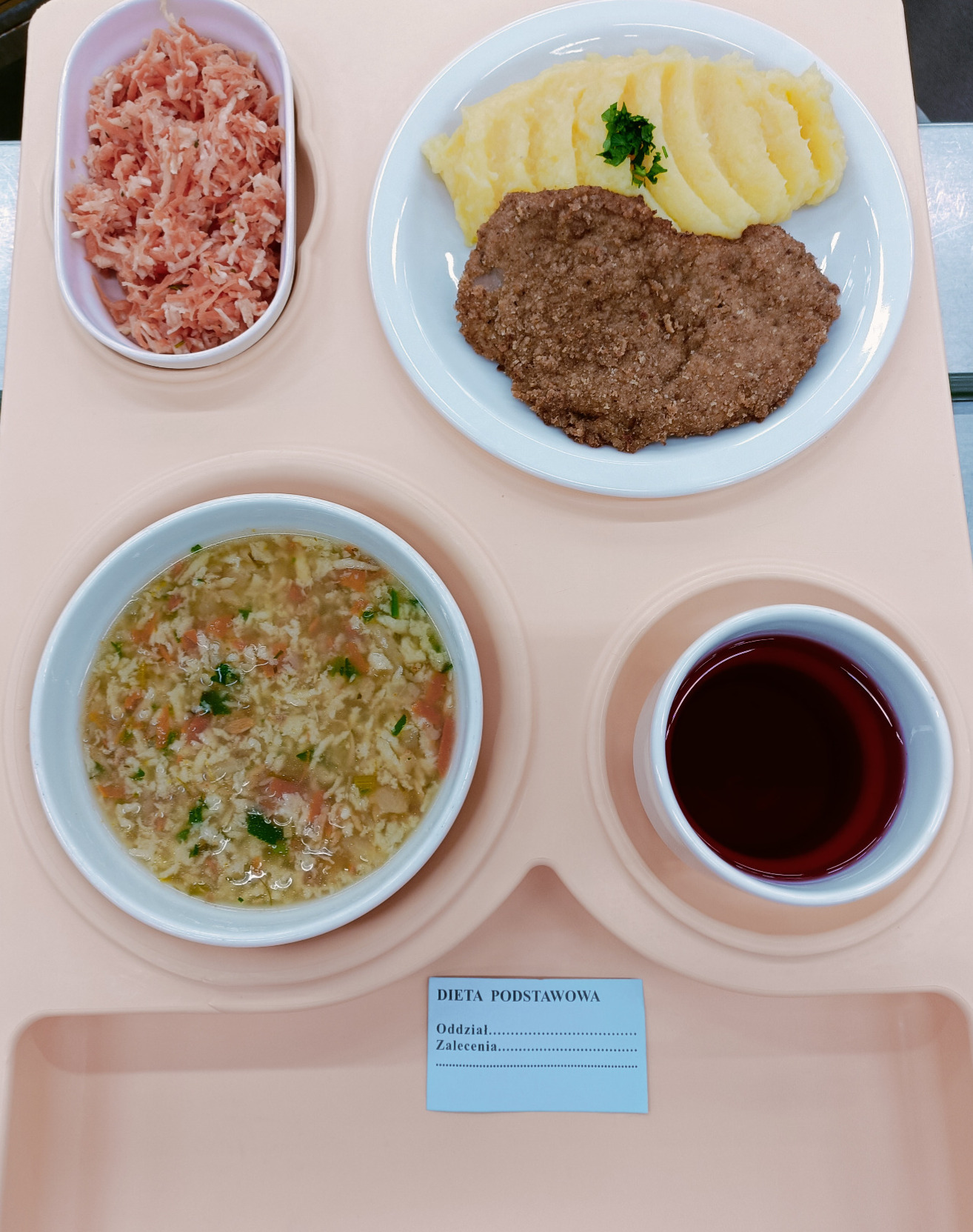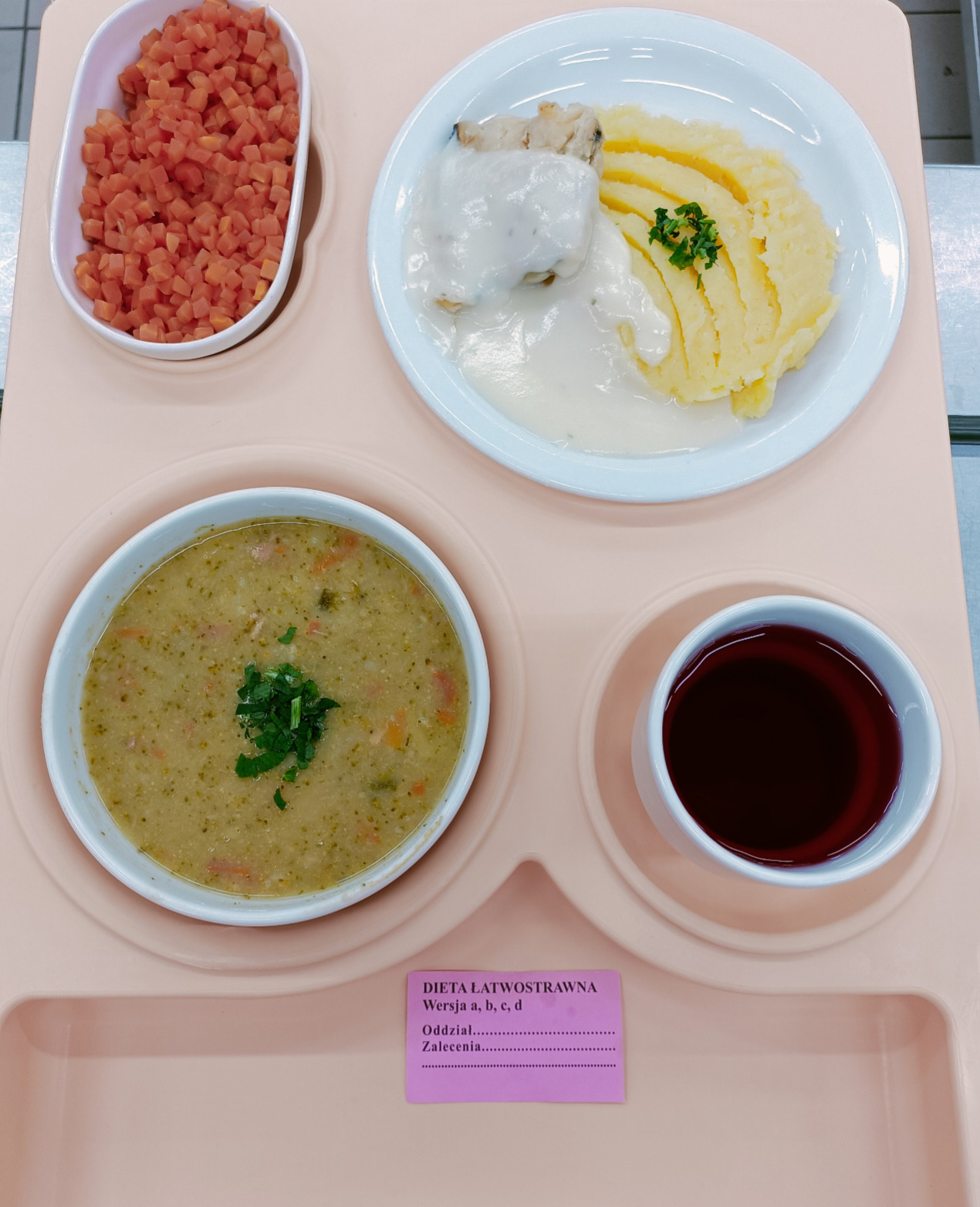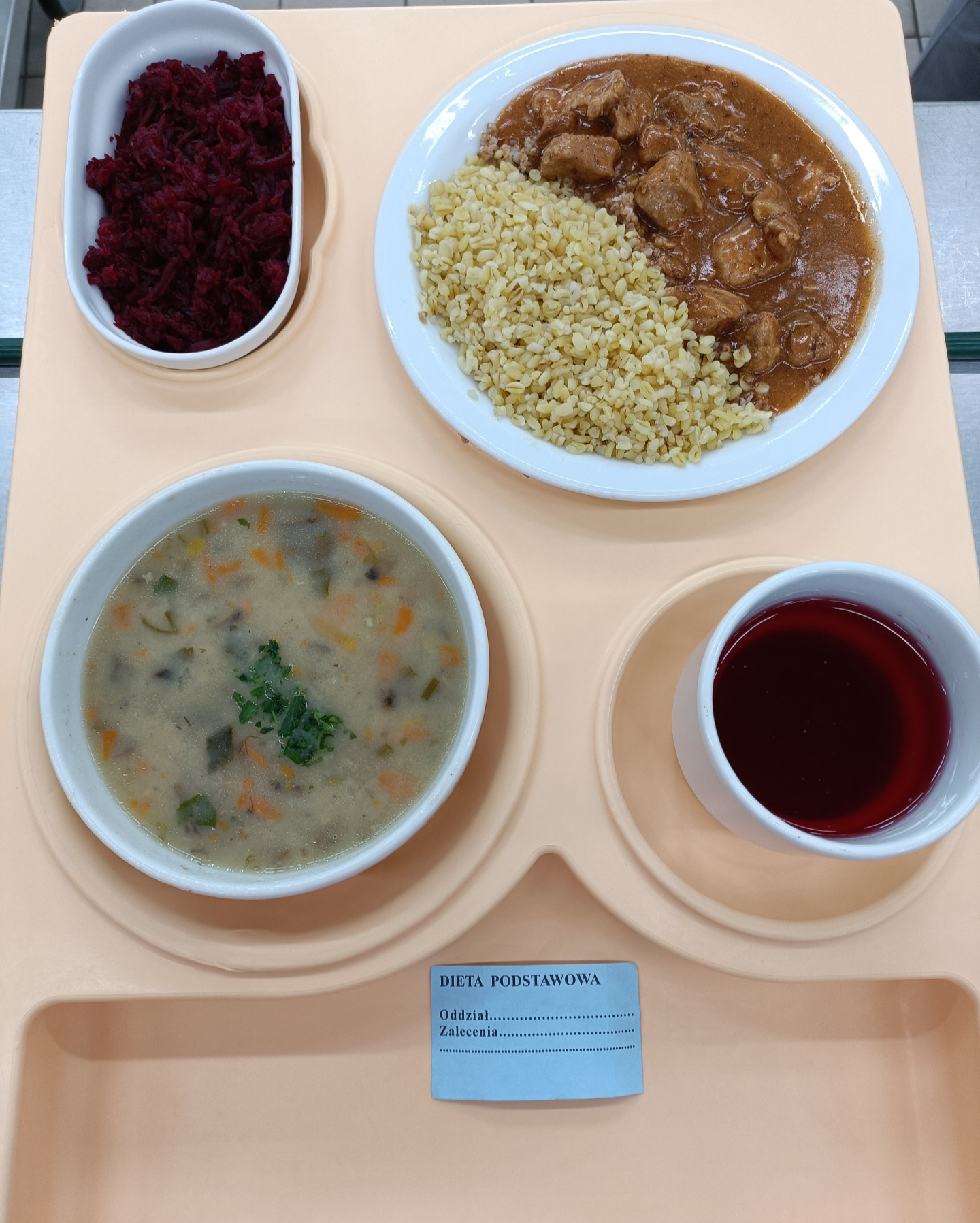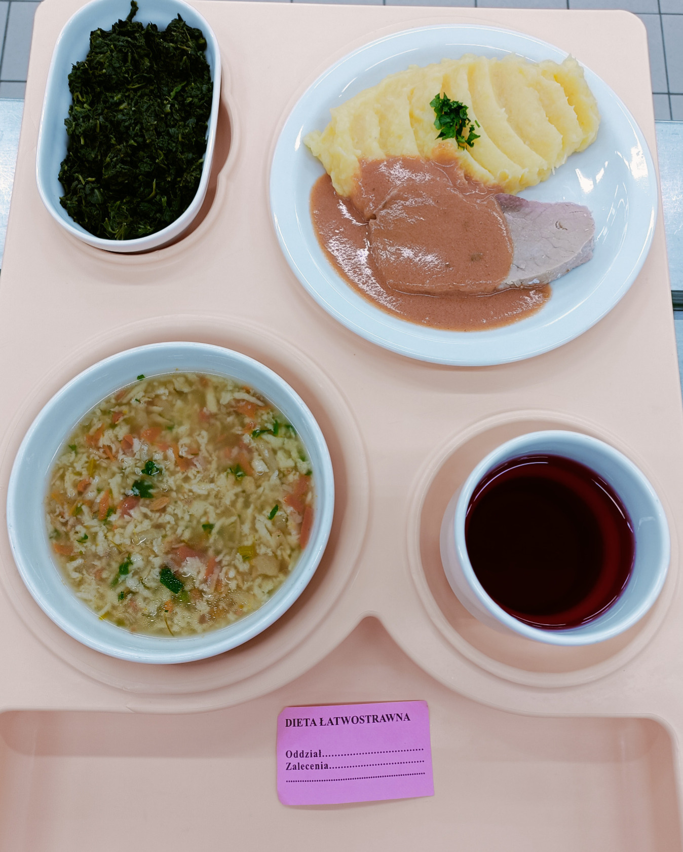 Krupnik ryżowy gotowany, dieta 300g mięsno od szynki gotowane 65g sos koperkowy, gotowany 80g buraki gotowane 120g ziemniaki gotowane 200g napój owocowy gotowany 200ml jabłko 1szt |