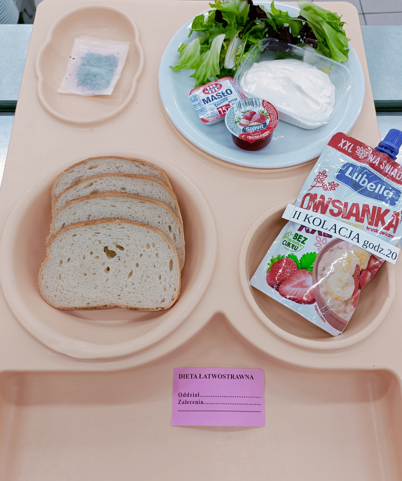 Herbata masło porcyjne 15g chleb pszenny 100g ser twarogowy 70g jajko gotowane 1szt mix sałat 12g II kolacja-tubka ryżowa 1szt-100g |