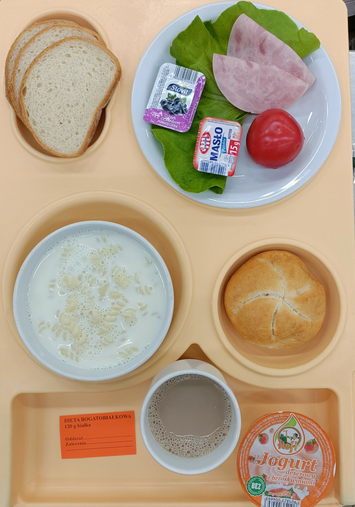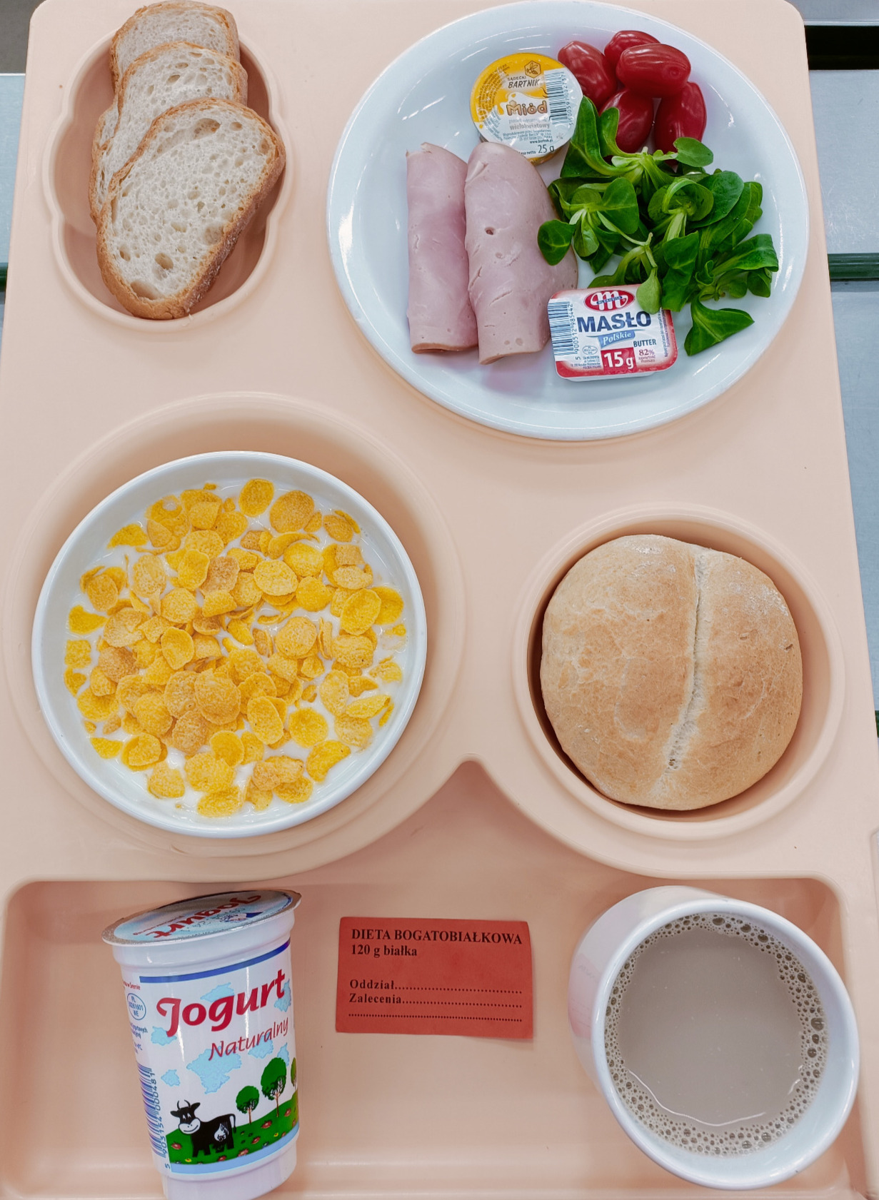 Zupa mleczna gotowana z płatkami kukurydzianymi 300g kawa zbożowa gotowana 200ml masło porcyjne 15g bułka pszenna 1szt chleb pszenny 80g szynkowa wieprzowa 50g miód 1szt-25g pomidorki koktajlowe 50g roszponka 6g jogurt naturalny 1szt-200g |