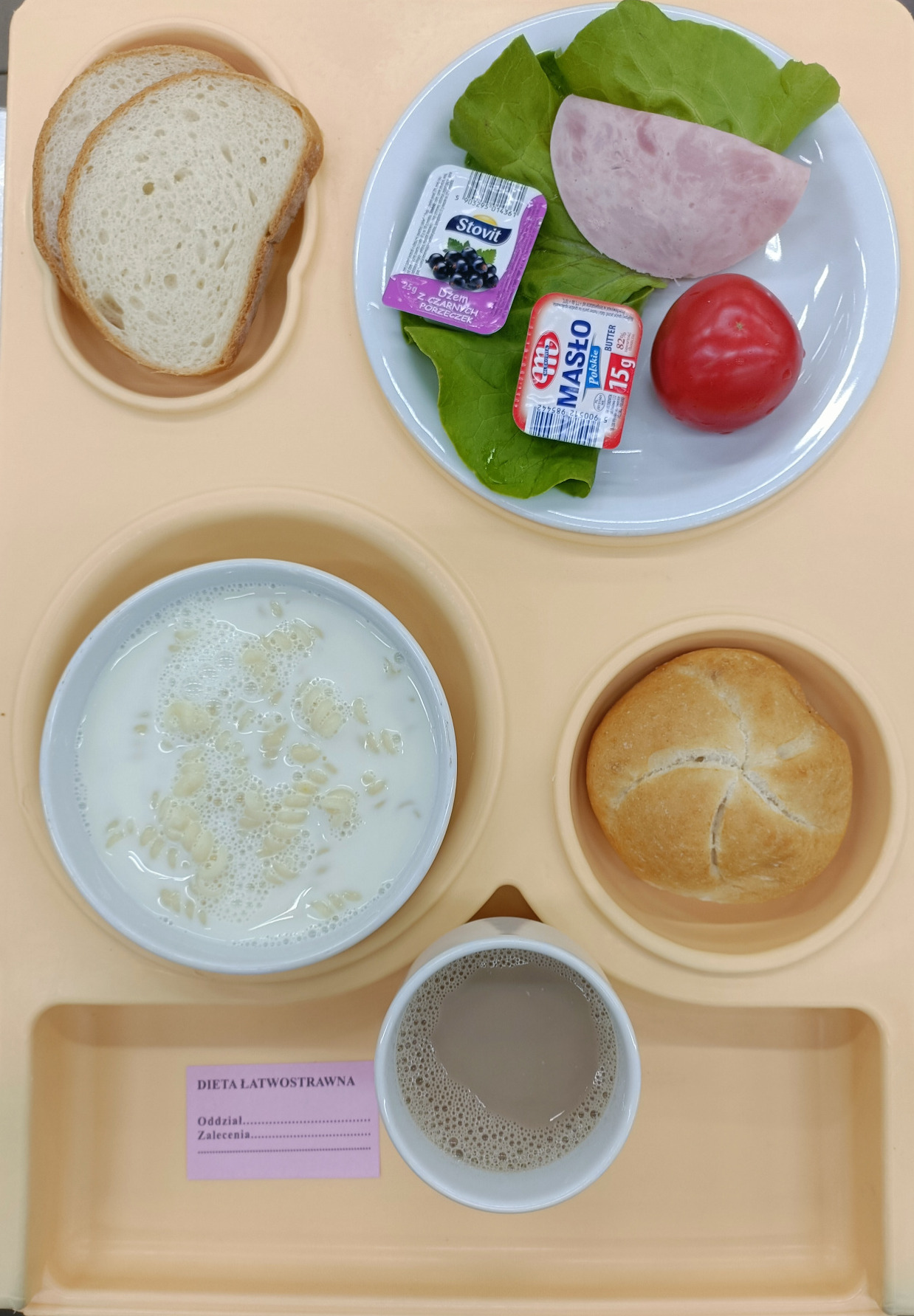Zupa mleczna gotowana z płatkami owsianymi 300ml kawa zbożowa gotowana 200ml masło porcyjne 15g bułka pszenna 1szt chleb pszenny 80g szynka z kurcząt 50g jajko gotowane 1szt pomidory 50g kiełki 4g jogurt owocowy 1szt-150g |