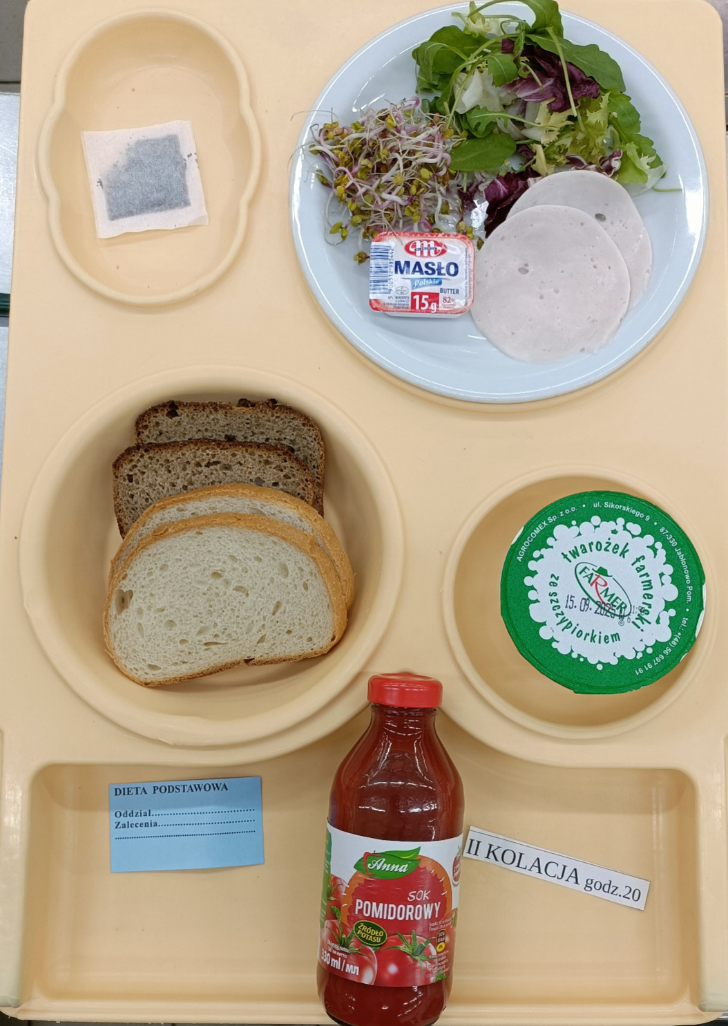 Herbata b/c masło porcyjne 15g chleb razowy 70g chleb graham 60g szynka delikatesowa 50g ser porcyjny 1szt-16,67g sałata 6g II kolacja- sok pomidorowy 1szt-330ml |