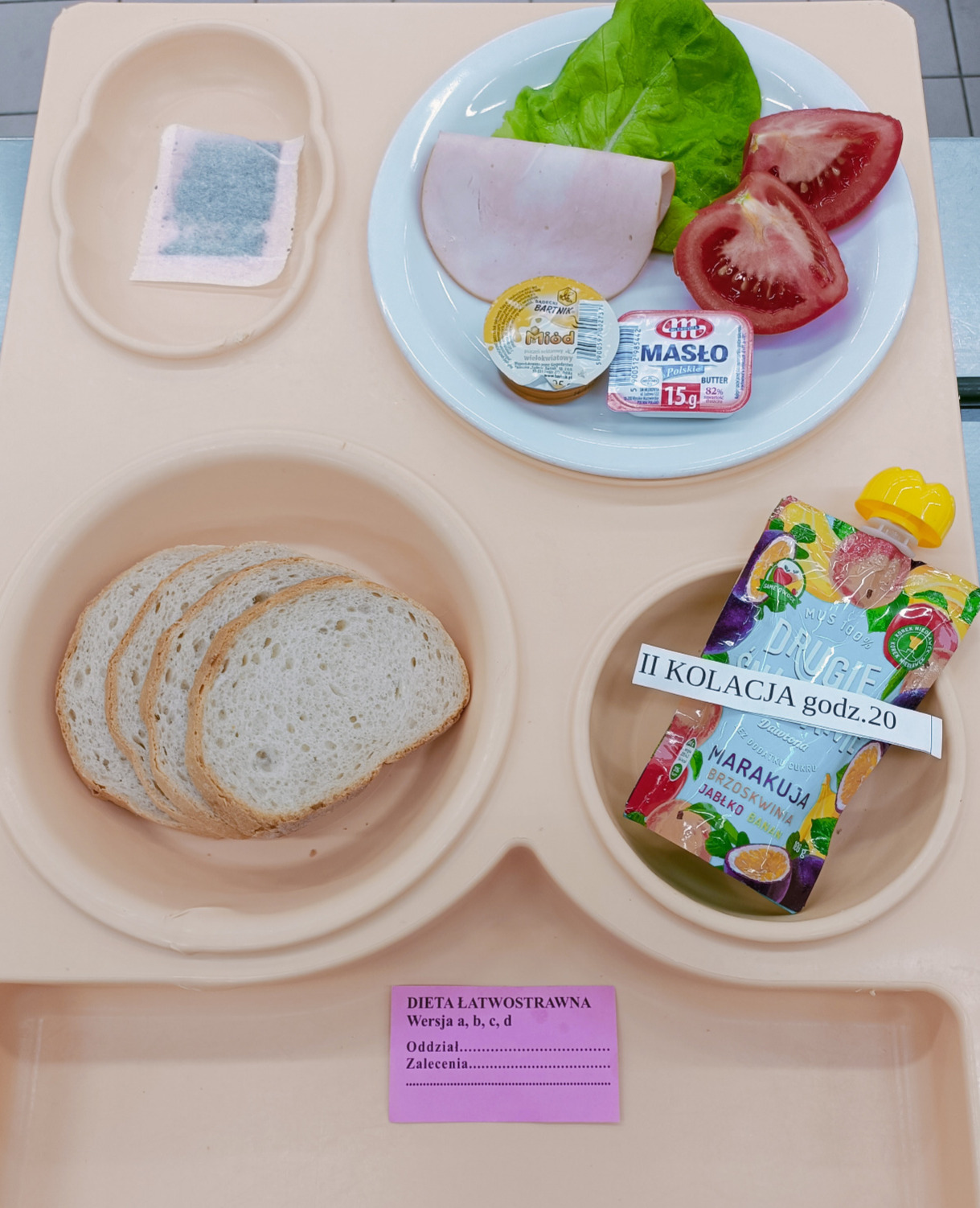 Herbata masło porcyjne 15g chleb razowy 50g chleb żytni 80g szynka delikatesowa 25g ser porcyjny1szt- 16,67g papryka świeża 60g sałata 6g II kolacja – mus owocowy 1szt-100g |
