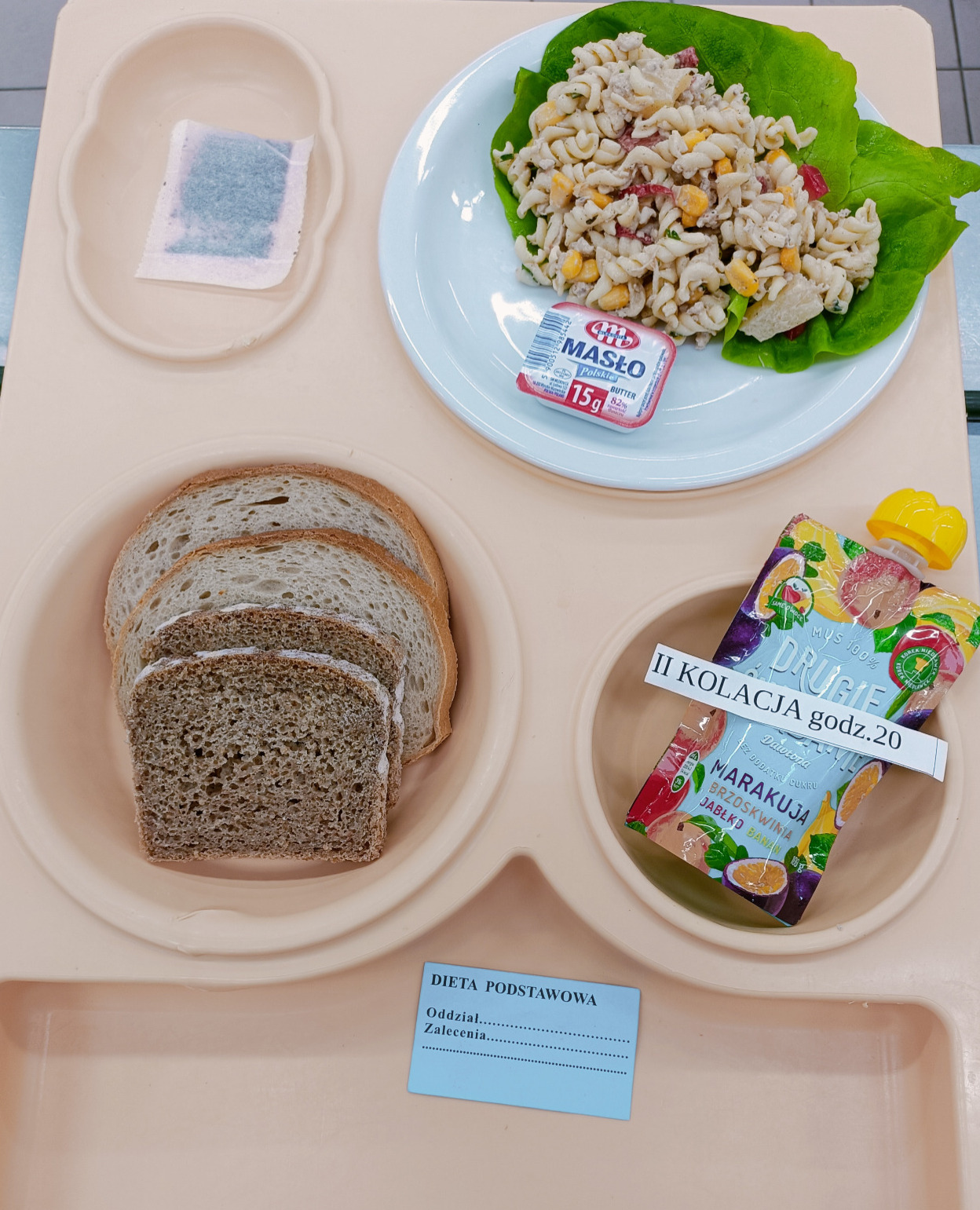 Herbata masło porcyjne 15g chleb pszenny 100g ser twarogowy 70g jajka gotowane 1szt kiełbasa golonkowa 25g mix sałat 12g II kolacja-tubka ryżowa 1szt-100g |