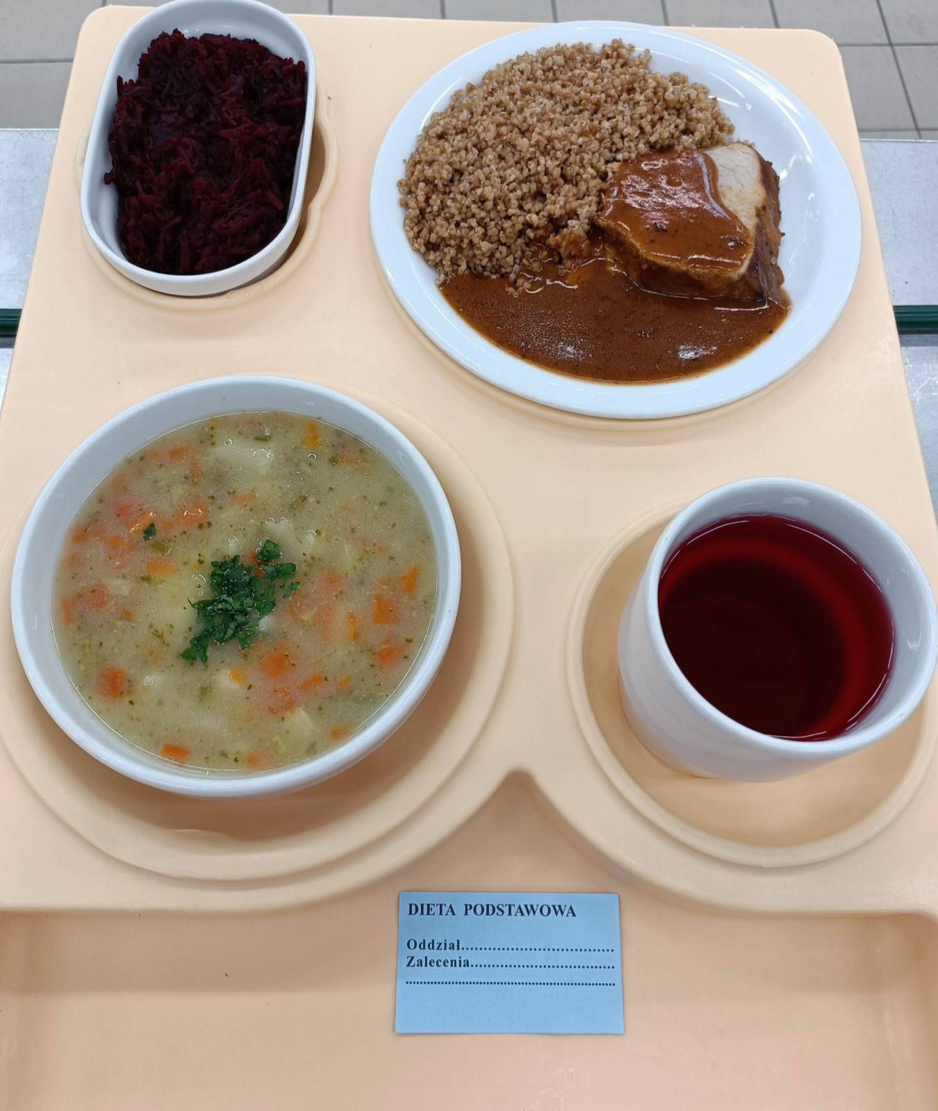 Zupa jarzynowa 3 skł gotowana, dieta 300g mięso od szynki gotowane 65g sos koperkowy gotowany 80g buraki gotowane 120g kasza orkiszowa gotowana 150g napój owocowy gotowany 20ml