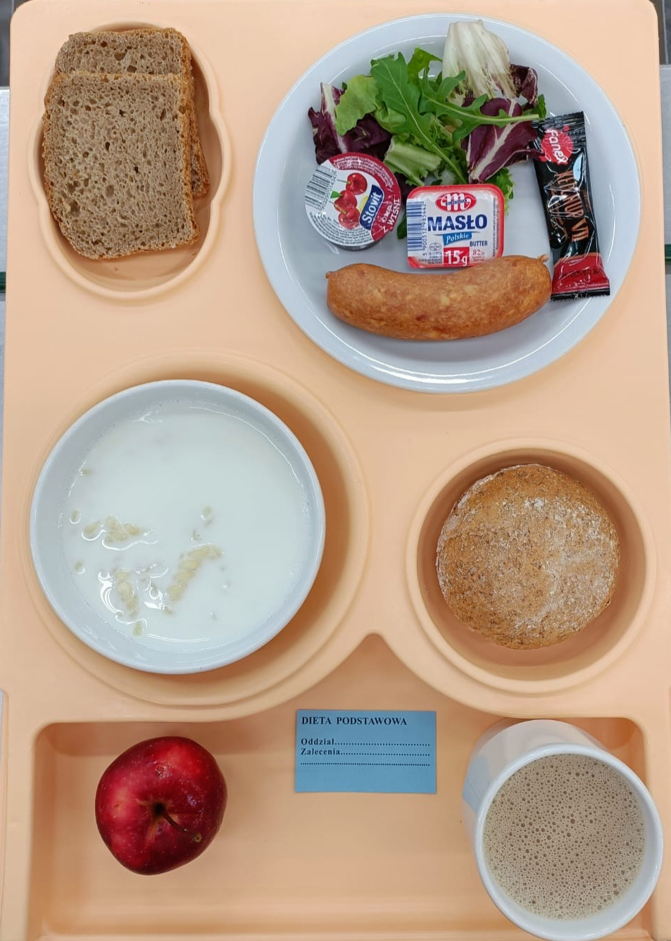 Zupa mleczna gotowana z makaronem 300g kawa zbożowa gotowana 200ml masło porcyjne 15g bułka grahamka 1szt chleb graham 80g kiełbasa śląska 100g ketchup 1szt-20g dżem 1szt-25g mix sałat 12g jabłko 150g |