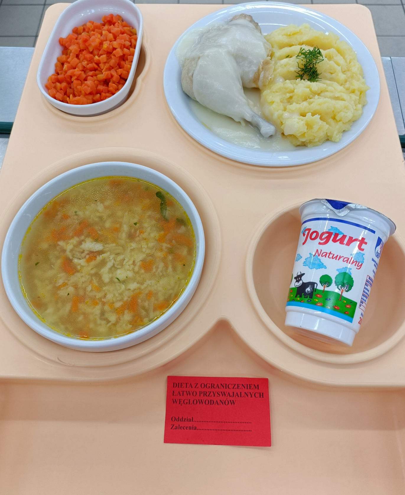 Barszcz gotowany z ziemniakami, dieta 300g filet z kurczaka gotowany 65g sos śmietanowy gotowany 80g mieszanka 3 skł gotowana 120g ziemniaki gotowane 200g sok pomidorowy 1szt-330ml |
