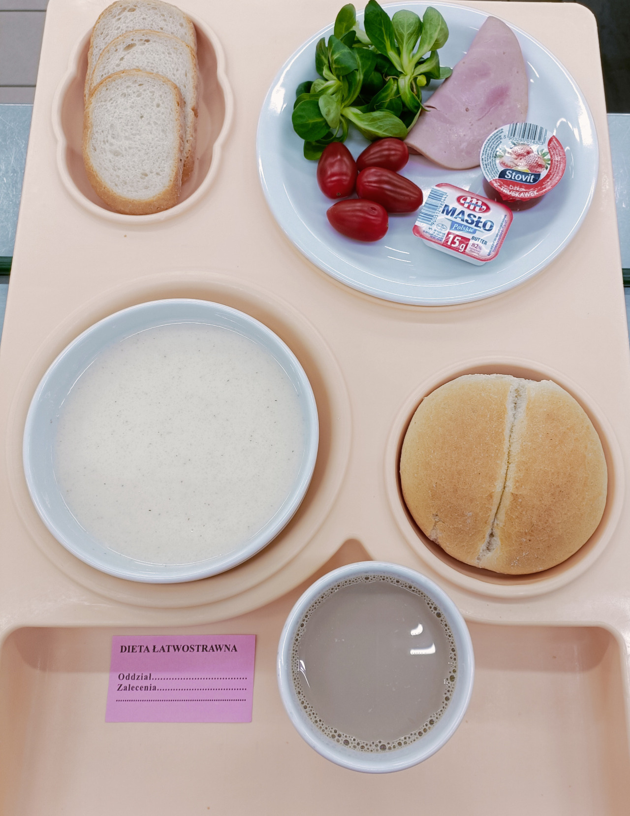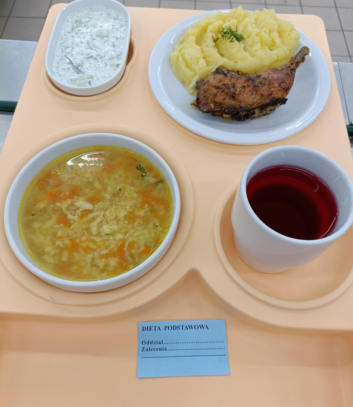 Zupa jarzynowa 3skł gotowana, dieta 300g mięso od szynki gotowane 65g sos koperkowy gotowany 80g buraki gotowane 120g kasza orkiszowa gotowana 150g maślanka 1szt-400ml |