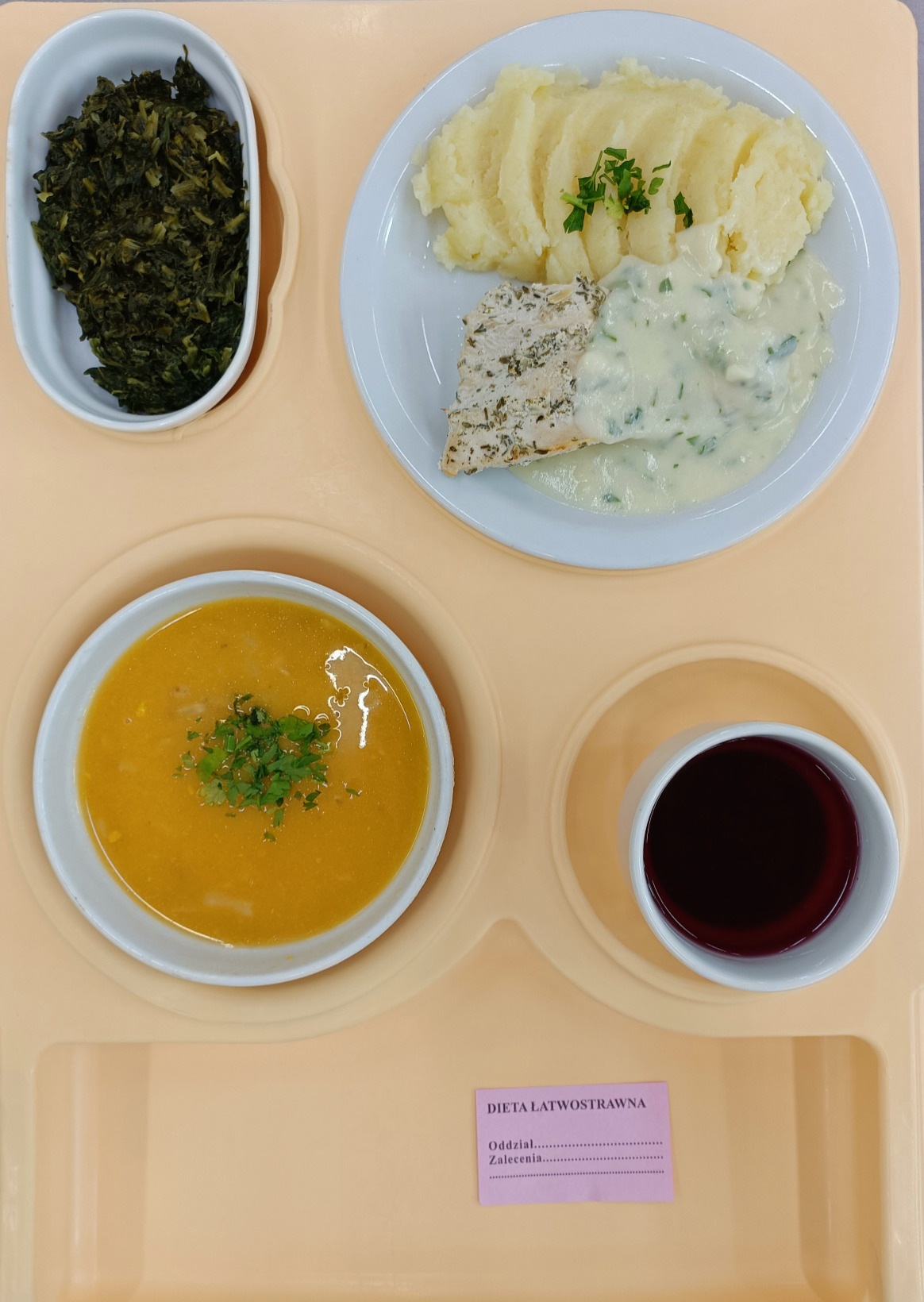 Zupa marchwiowa gotowana 300g indyk pieczony 65g sos pietruszkowy gotowany 80g szpinak mrożony gotowany 120g ziemniaki gotowane 200g napój owocowy gotowany 200ml |