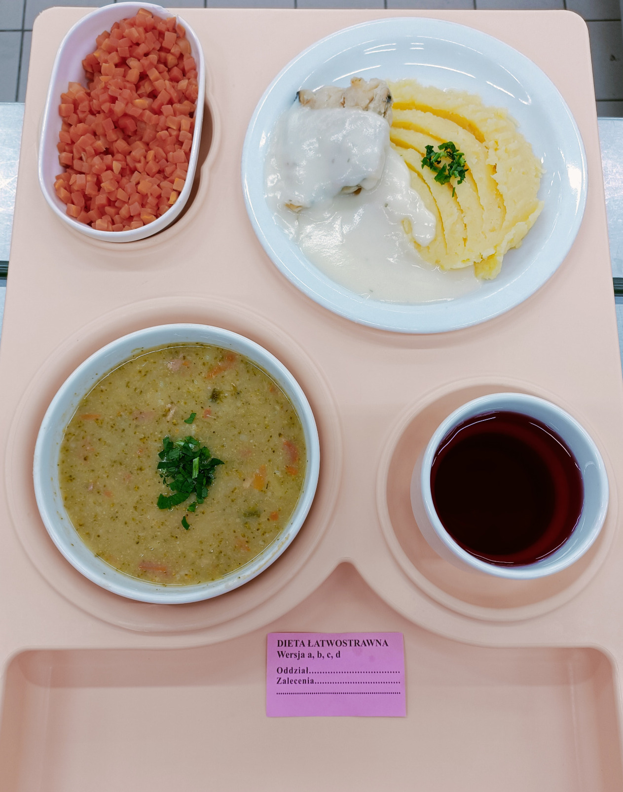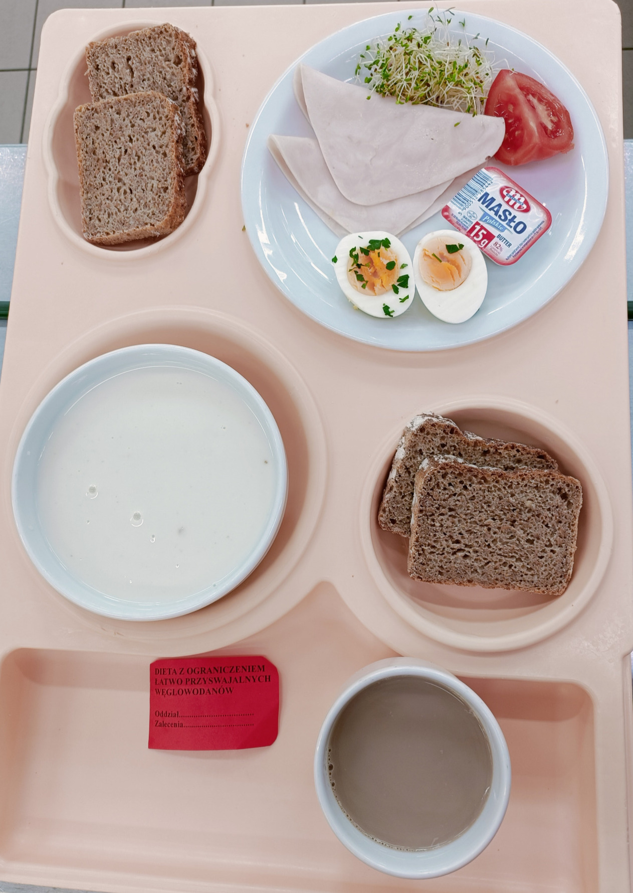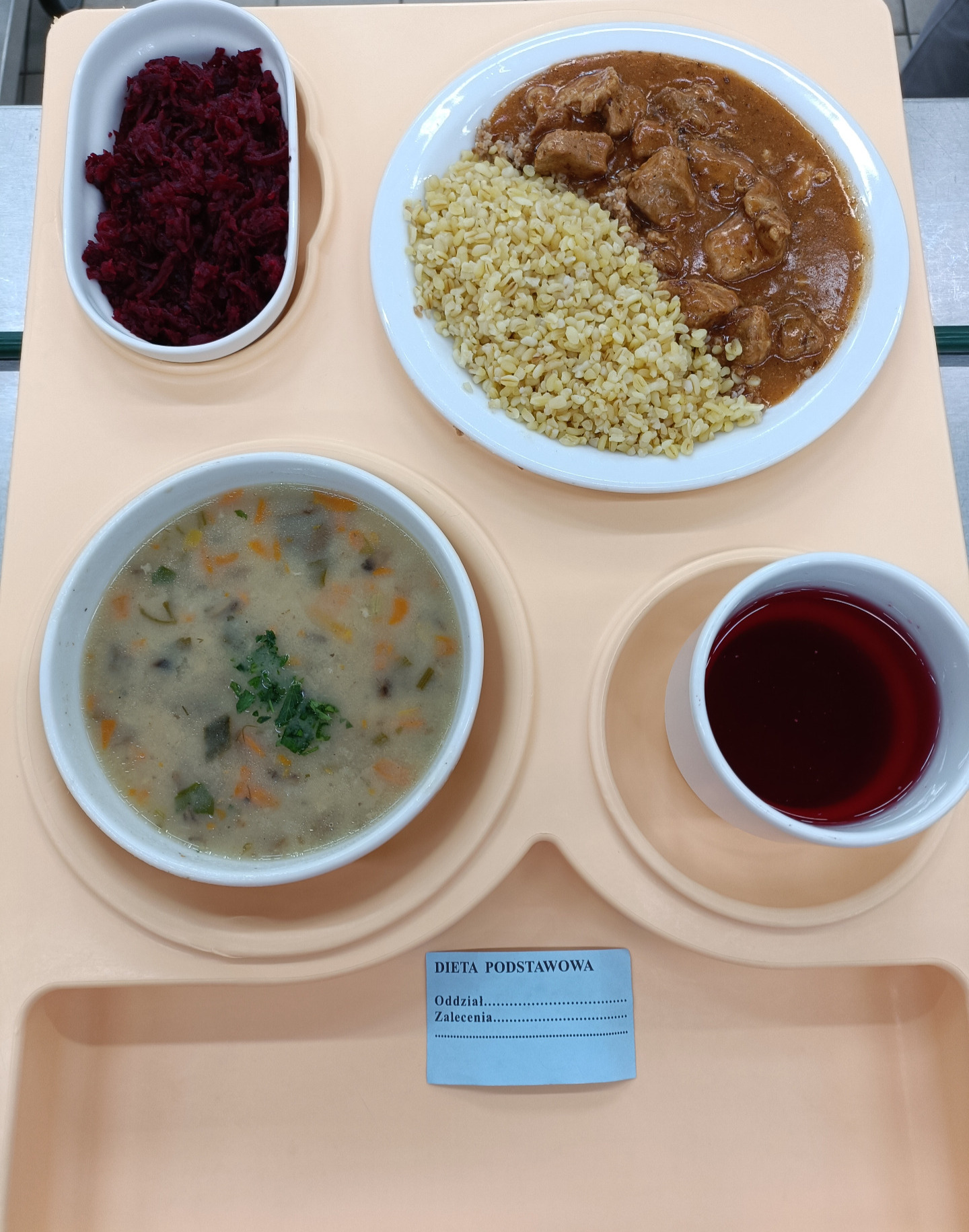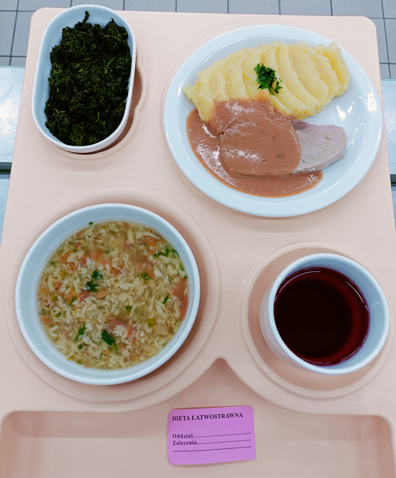 Krupnik ryżowy gotowany, dieta 300g mięso od szynki, gotowane 65g sos koperkowy, gotowany 80g buraki gotowane 120g ziemniaki gotowane 200g napój owocowy gotowany 200ml |