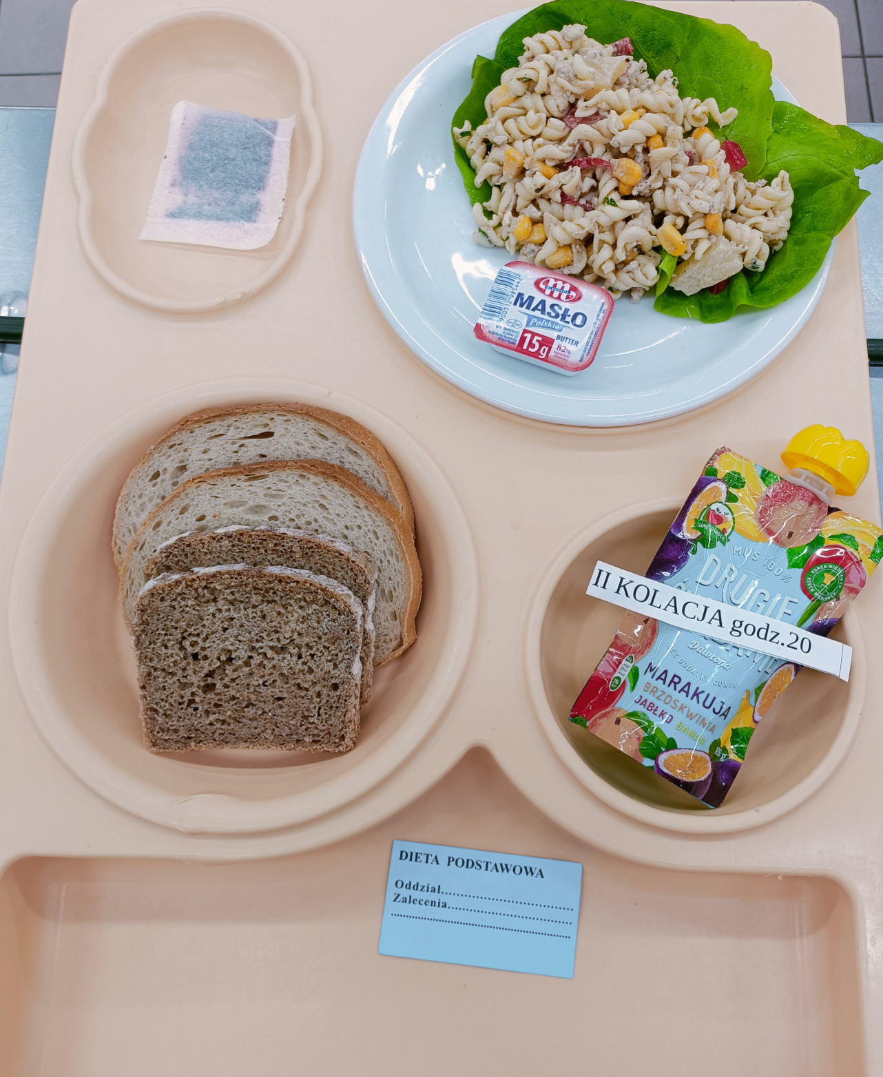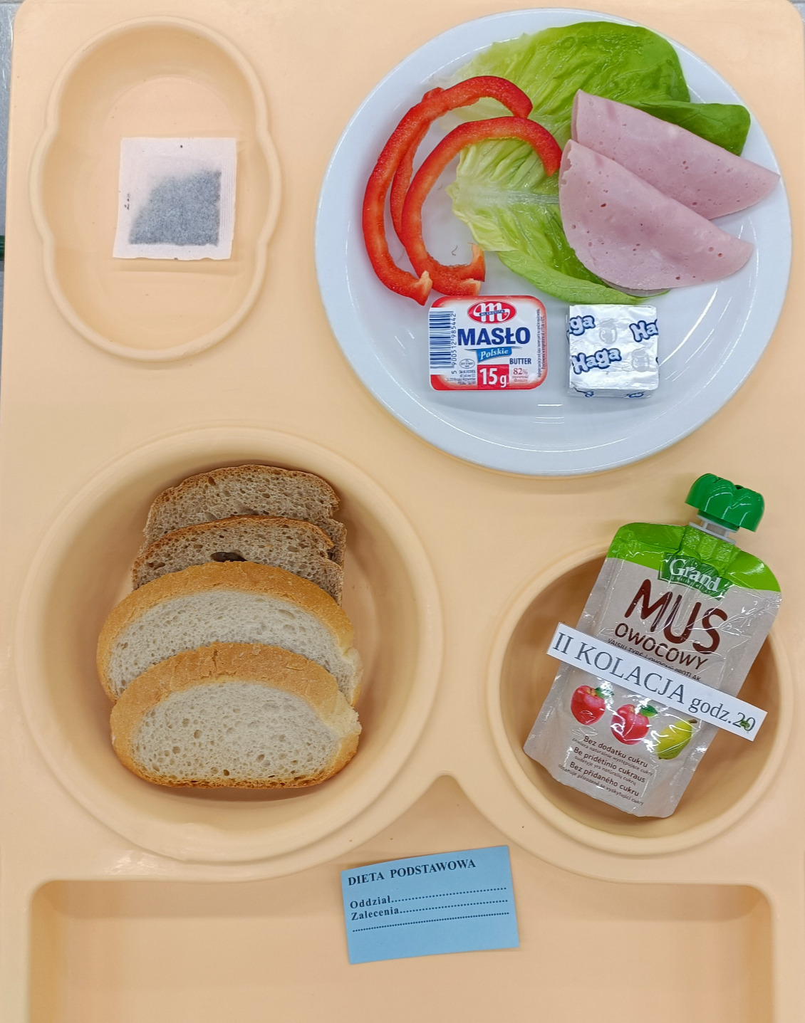 Herbata masło porcyjne 15g chleb razowy 50g chleb żytni 80g szynka delikatesowa 25g ser porcyjny1szt- 16,67g papryka świeża 60g sałata 6g II kolacja – mus owocowy 1szt-100g |