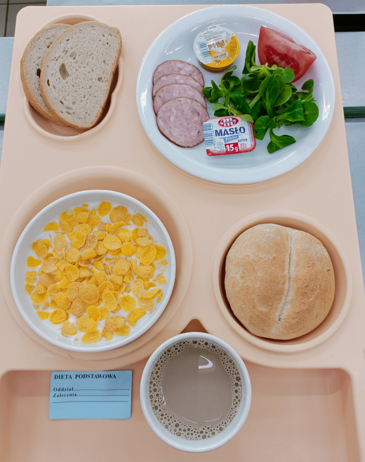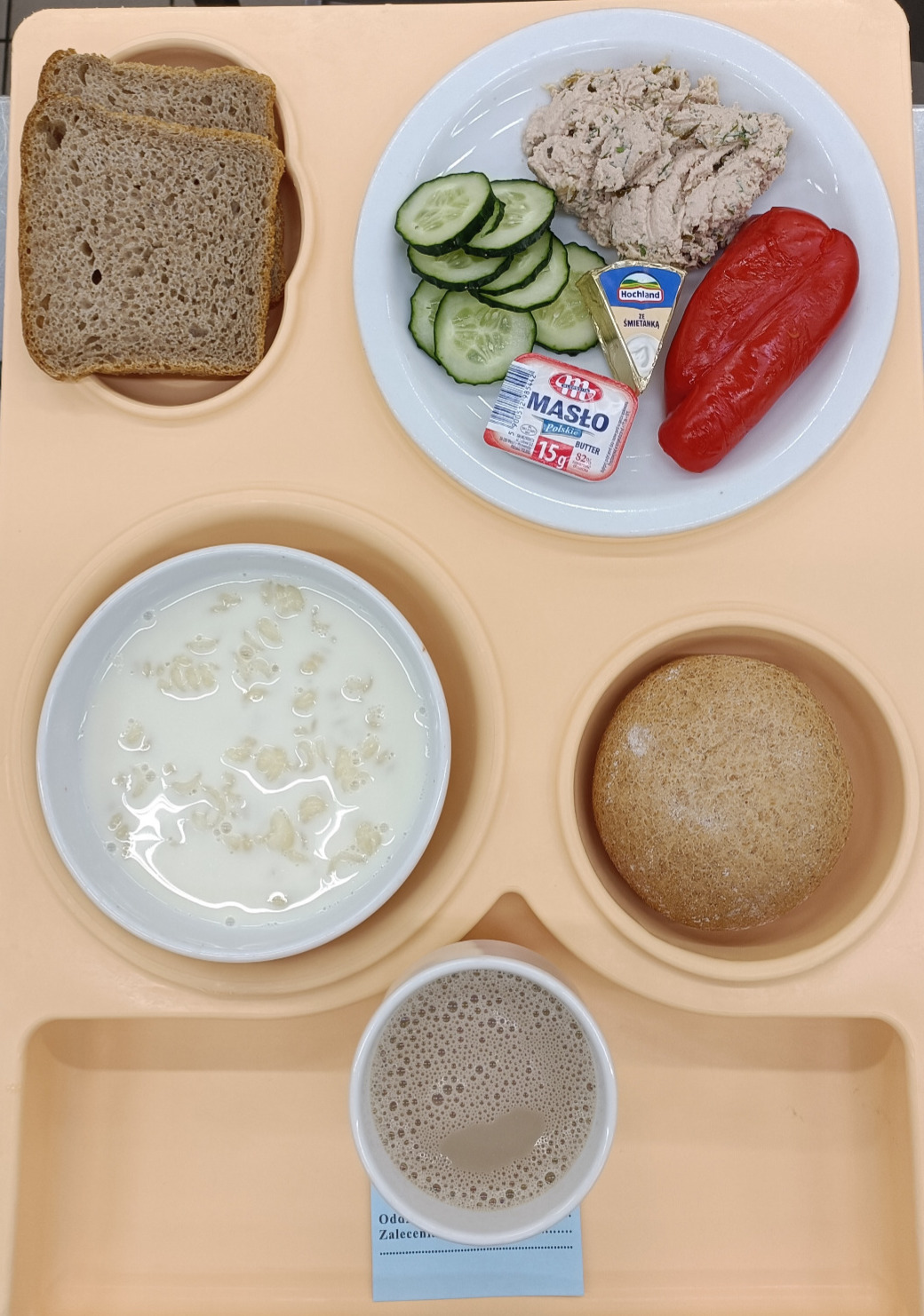 Zupa mleczna gotowana z płatkami kukurydzianymi 300g kawa zbożowa gotowana 200ml masło porcyjne 15g chleb razowy 70g chleb graham 60g szynkowa wieprzowa 75g pomidorki koktajlowe 50g roszponka 6g |