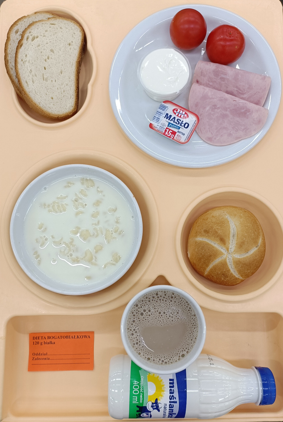 Kawa zbożowa gotowana 200ml masło porcyjne 15g bułka pszenna 1szt chleb pszenny 80g szynka sołacka 75g ser porcyjny 1szt- 16,67g pomidorki koktajlowe 50g roszponka 6g maślanka 1szt-400ml |