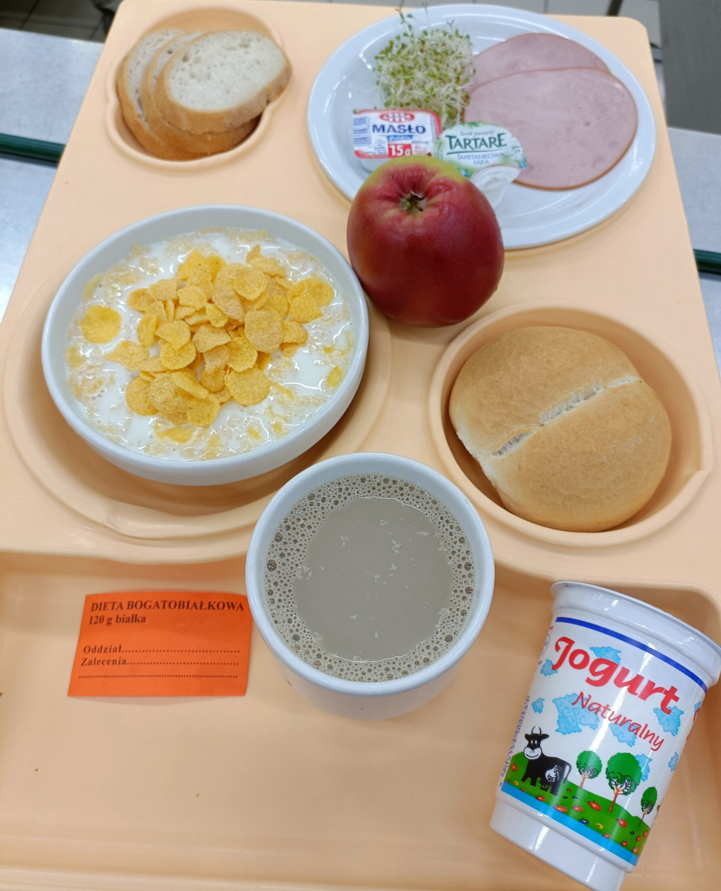 Kawa zbożowa gotowana 200ml masło porcyjne 15g bułka pszenna 1szt chleb pszenny 80g szynka złota z indyka 75g ser porcyjny 1szt- 16,67g pomidor 100g kiełki 4g jogurt naturalny 1szt-200g |