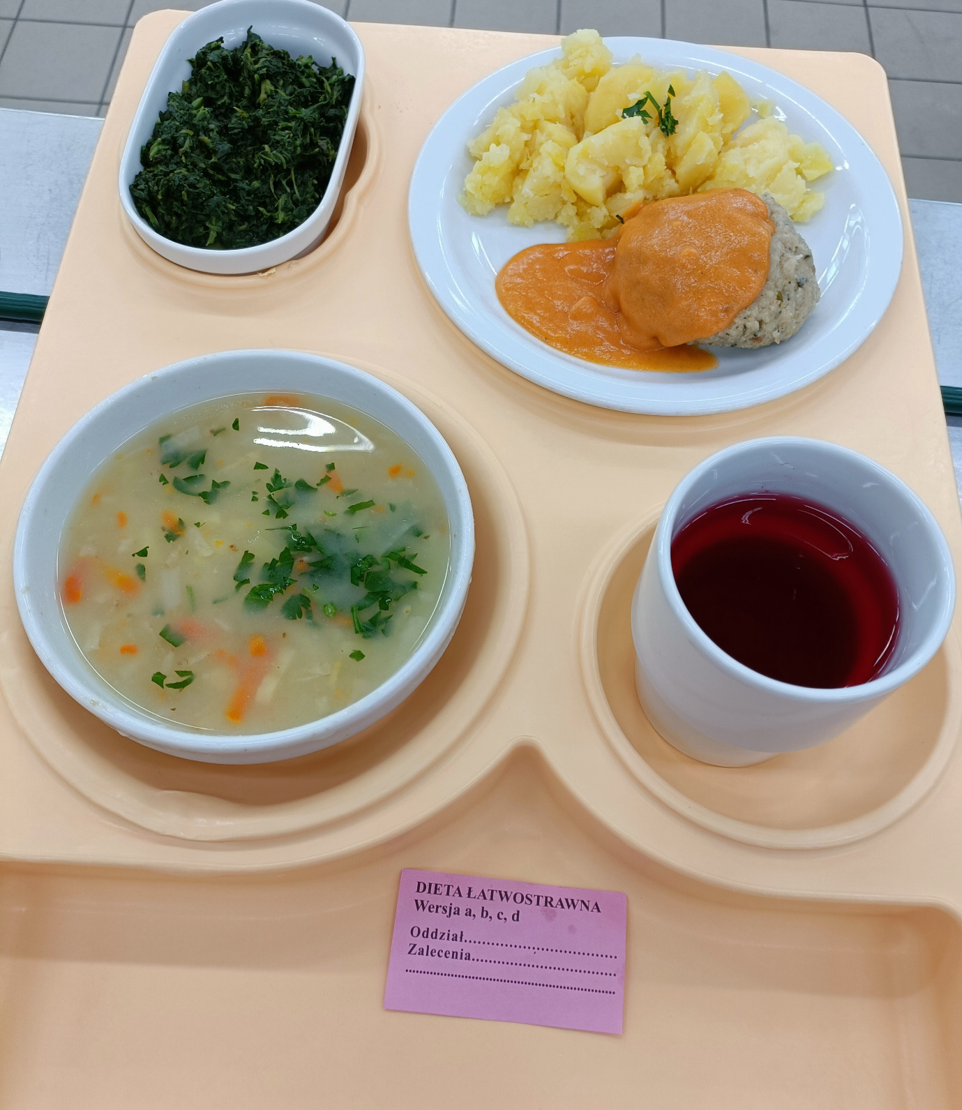 Zupa jarzynowa 3 skł gotowana, dieta 300g pulpety rybne gotowane 70g sos pietruszkowy gotowany 80g szpinak mrożony gotowany 120g ziemniaki gotowane 200g napój owocowy gotowany 200ml |