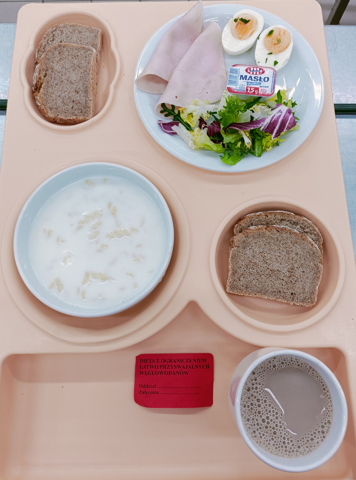 Zupa mleczna gotowana z ryżem 300g kawa zbożowa gotowana 200ml masło porcyjne 15g chleb graham 60g chleb razowy 70g szynka konserwowa 75g pomidor koktajlowy 50g sałata 6g |
