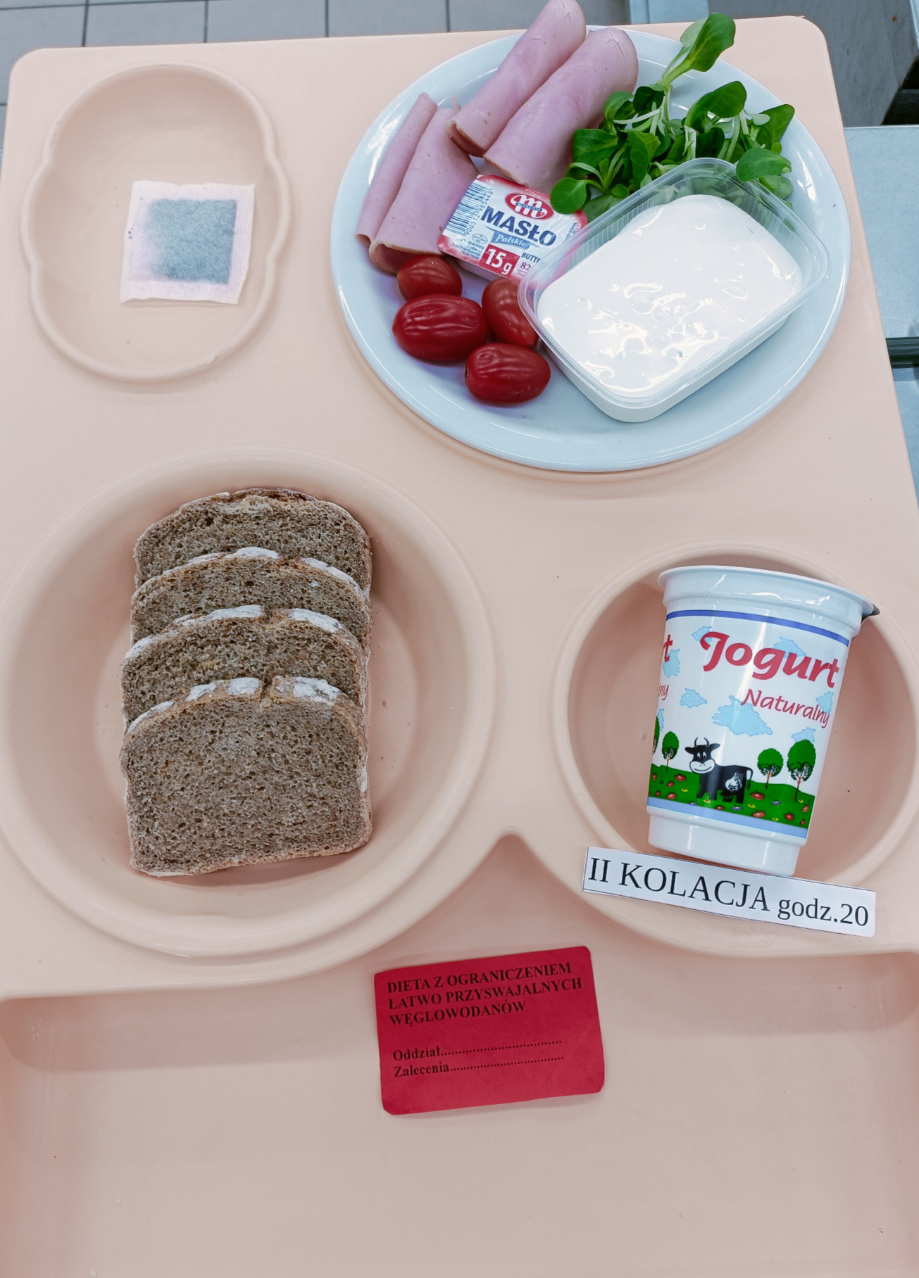 Herbata masło porcyjne 15g chleb pszenny 100g szynkowa wieprzowa 75g ser tartat 1szt-20g roszponka 6g II kolacja jogurt naturalny 1szt-200g |