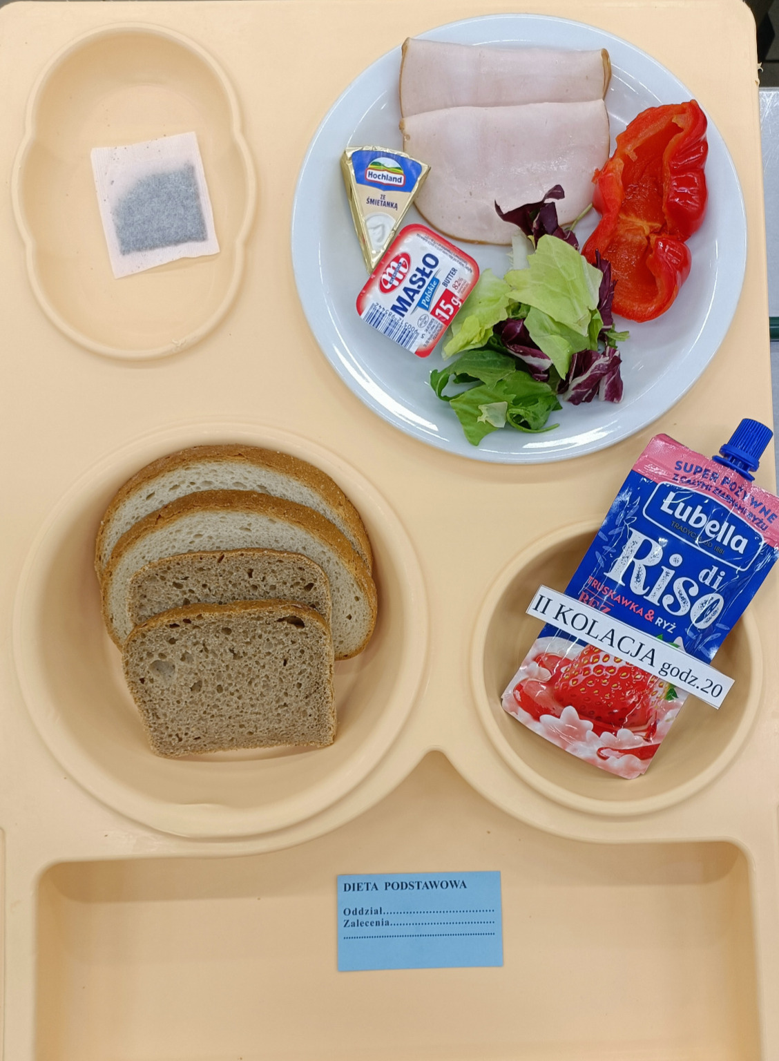 Herbata masło porcyjne 15g chleb razowy 50g chleb żytni 80g polędwica drobiowa 25g ser twarogowy 70g papryka świeża 60g ogórek kons 50g II kolacja- tubka ryżowa 1szt-100g |