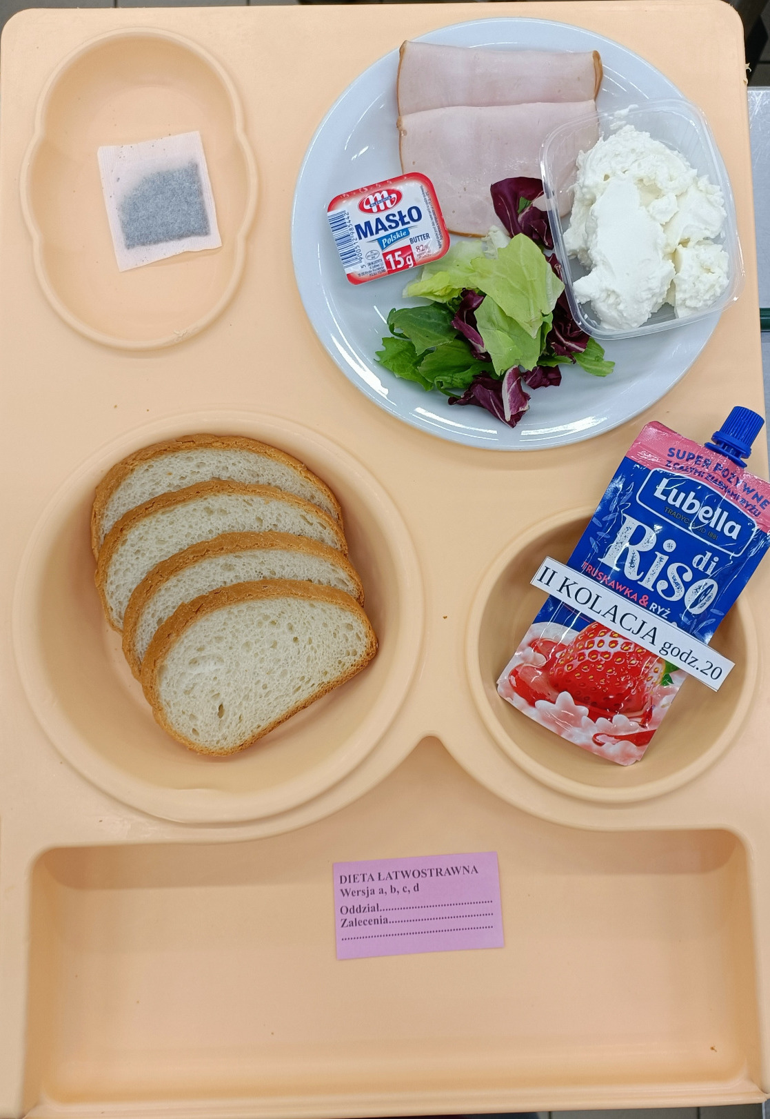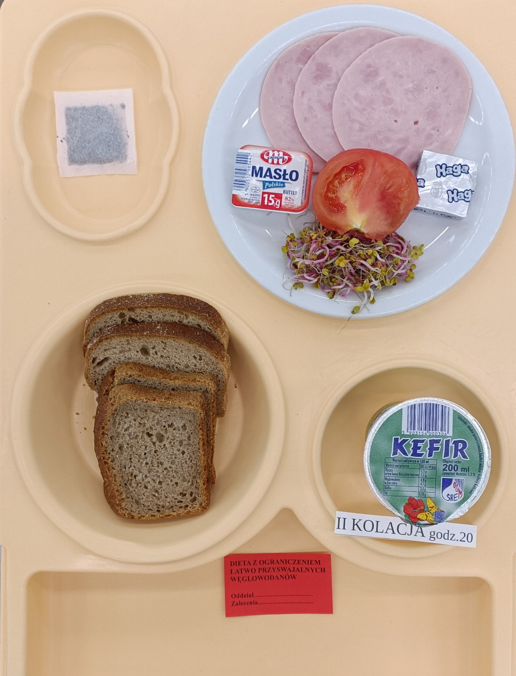 Herbata masło porcyjne 15g chleb pszenny 100g szynka konserwowa 50g sałatka jarzynowa dieta 100g sałata 6g II kolacja - kefir 1szt-250g |