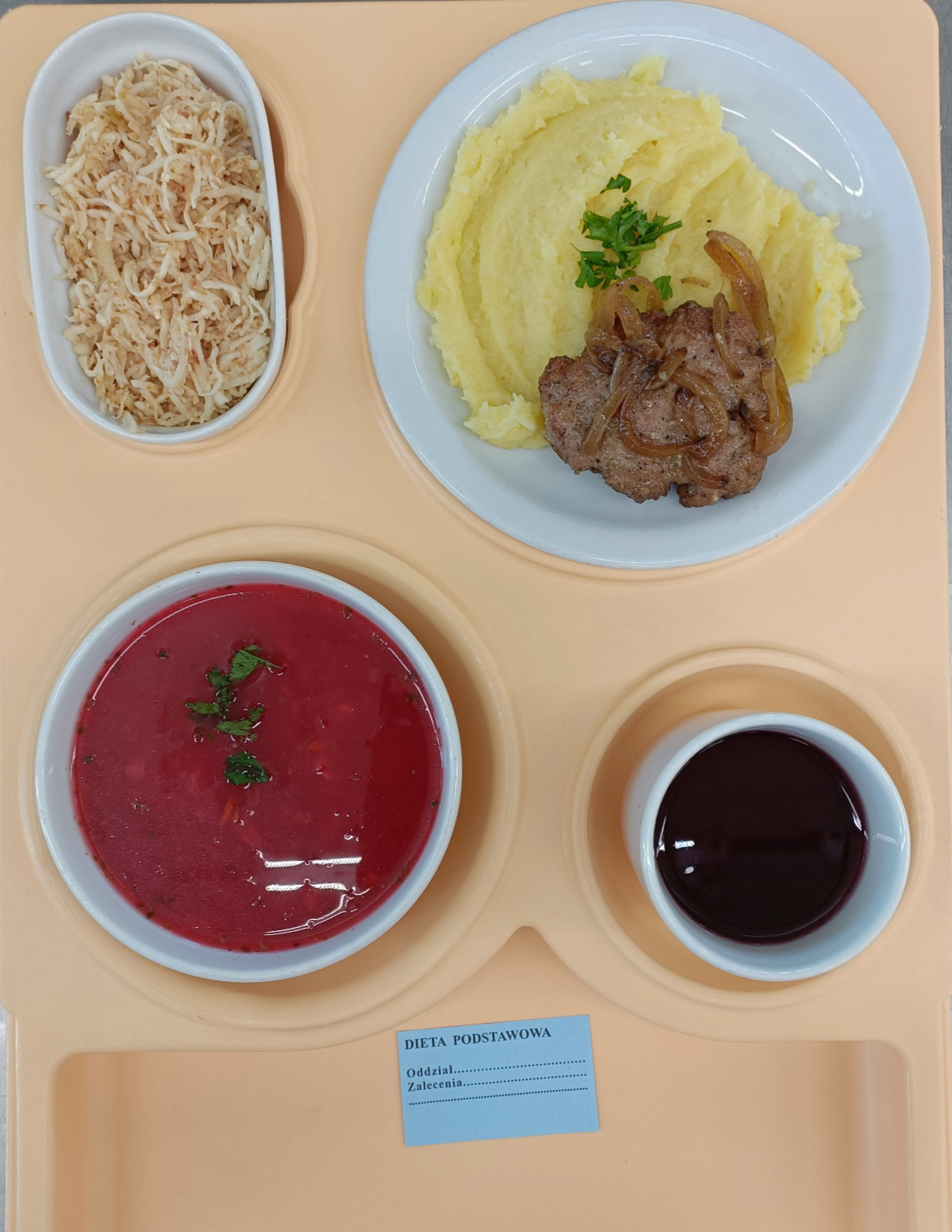 Zupa krupnik ryżowy gotowany, dieta 300g pulpet z mięsa od szynki 70g sos koperkowy gotowany 80g buraki gotowane 120g ziemniaki gotowane 200g napój owocowy gotowany 200ml budyń gotowany 200g |