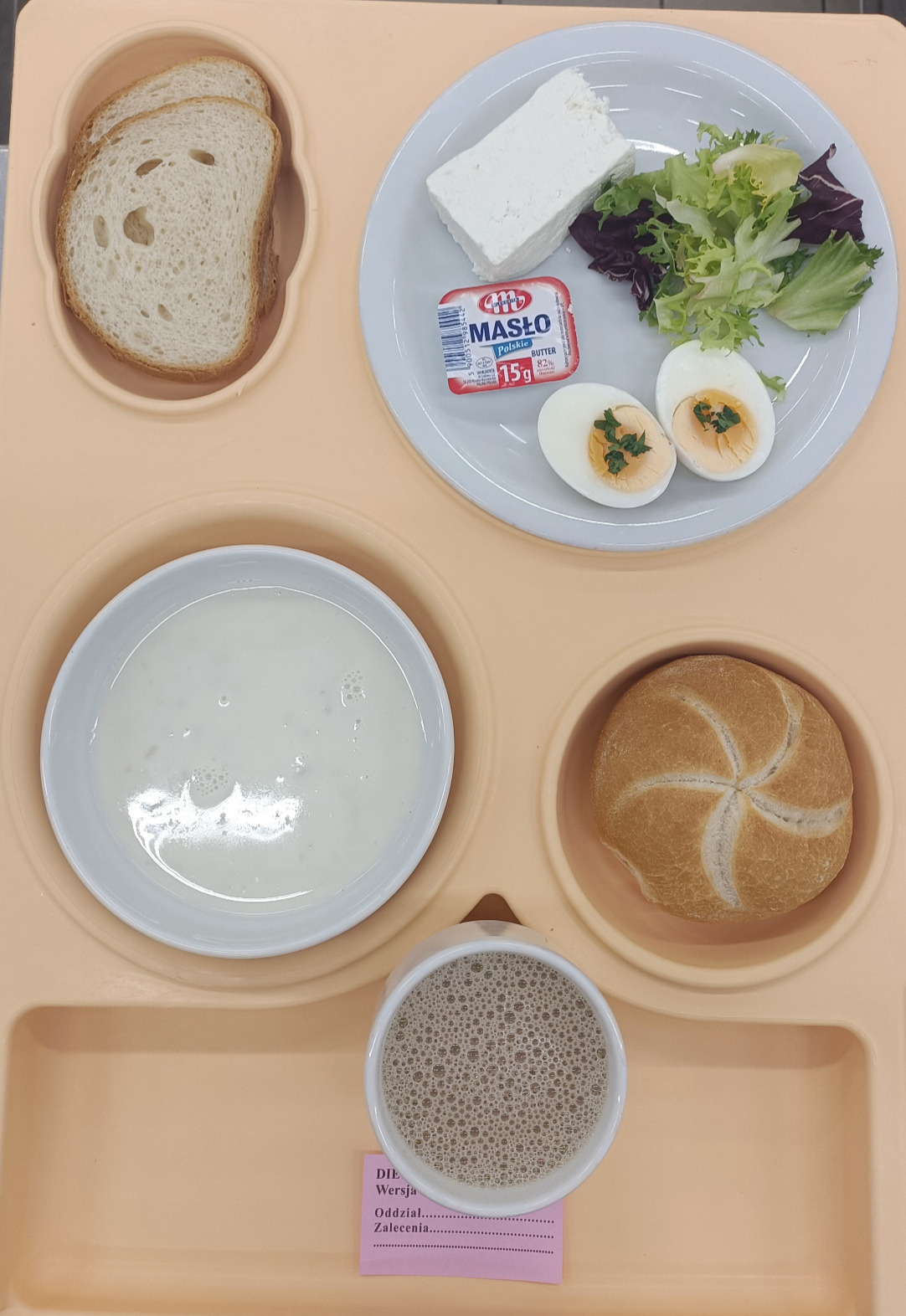 Zupa mleczna gotowana z makaronem 300g kawa zbożowa gotowana 200ml masło porcyjne 15g bułka pszenna 1szt chleb pszenny 80g szynka z kurcząt 50g jajko gotowane 1szt mix sałat 12g maślanka 1szt-400ml |