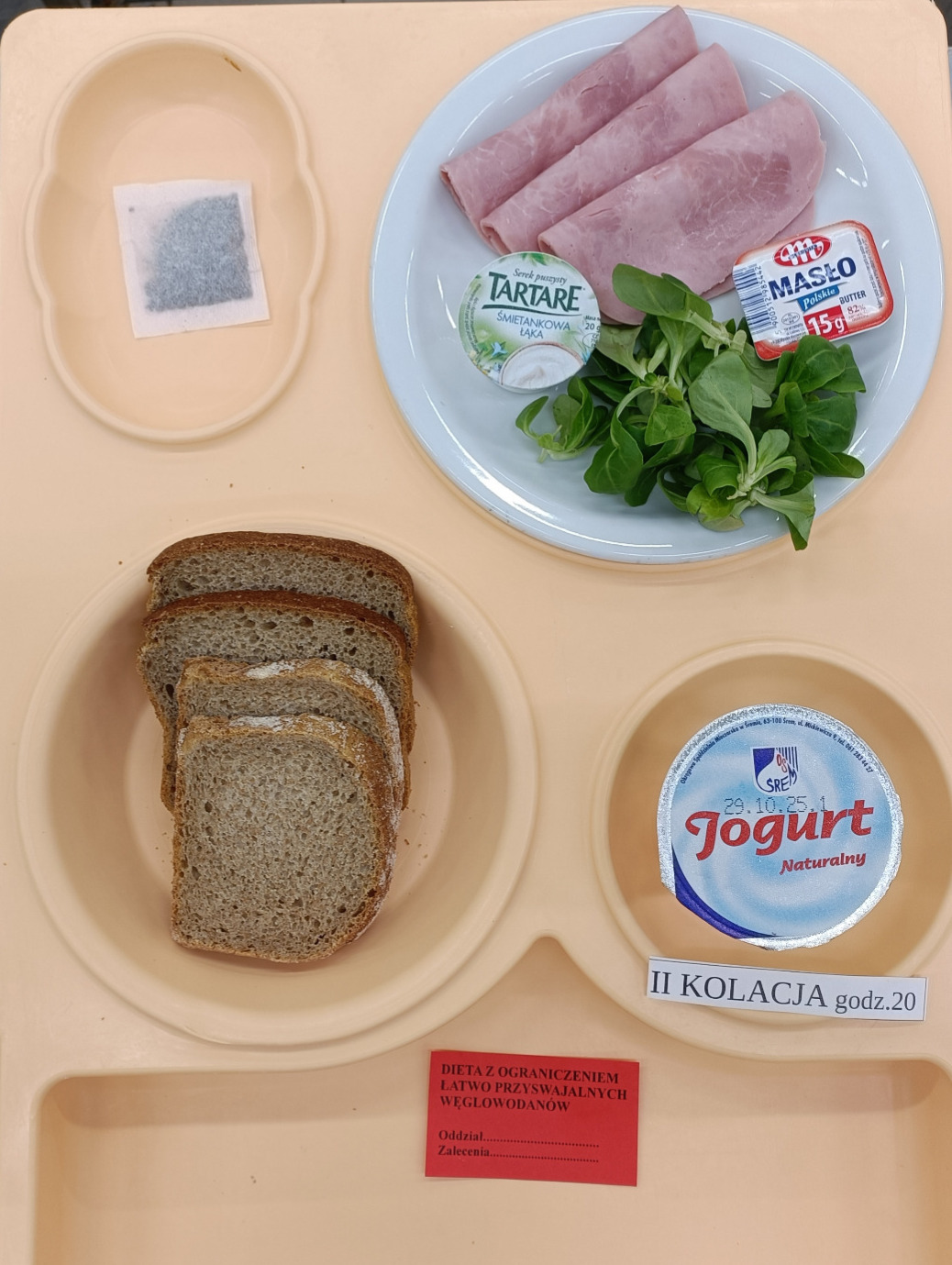 Herbata masło porcyjne 15g chleb pszenny 100g szynka konserwowa 25g sałatka jarzynowa dieta 100g sałata 6g II kolacja- tubka owsiana 1szt-100g |