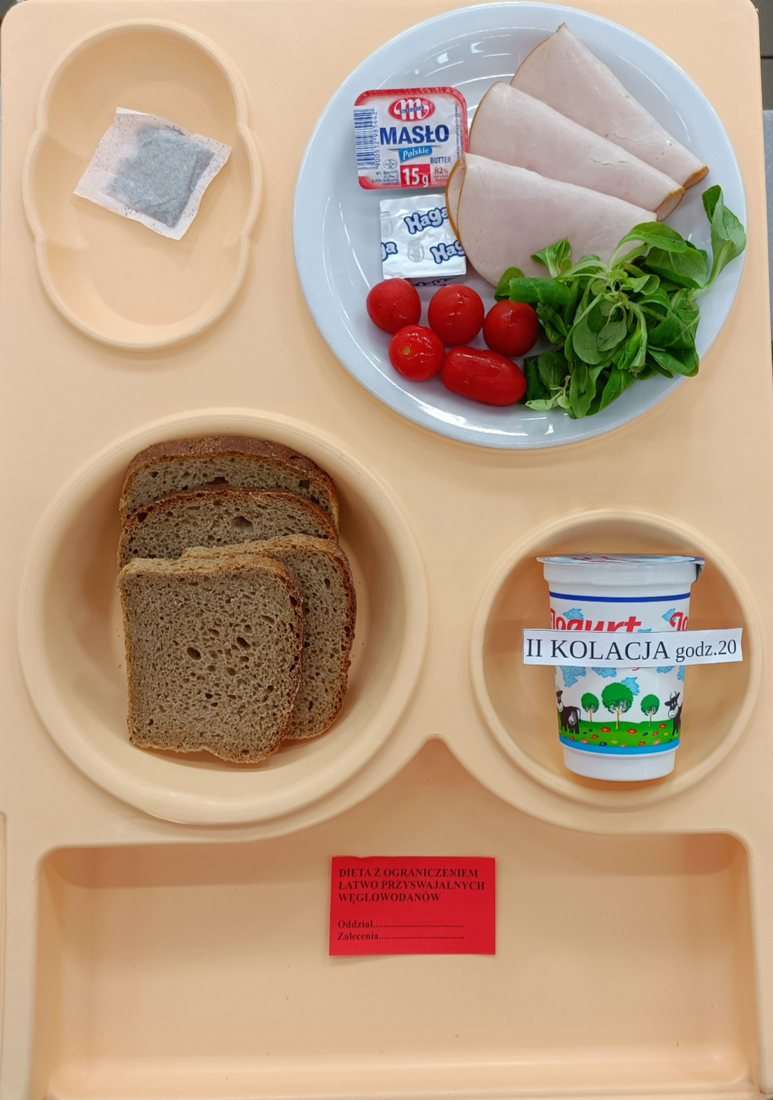 Herbata masło porcyjne 15g chleb pszenny 100g polędwica drobiowa 75g ser homo 50g pomidor koktajlowy 50g roszponka 6g II kolacja-jogurt naturalny 1szt-200g |