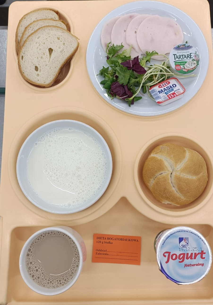 Zupa mleczna gotowana z ryżem 300g kawa zbożowa gotowana 200ml masło porcyjne 15g bułka pszenna 1szt chleb pszenny 80g szynka złota z indyka 25g ser tartar 1szt- 20g kiełki 4g mix sałat 12g |