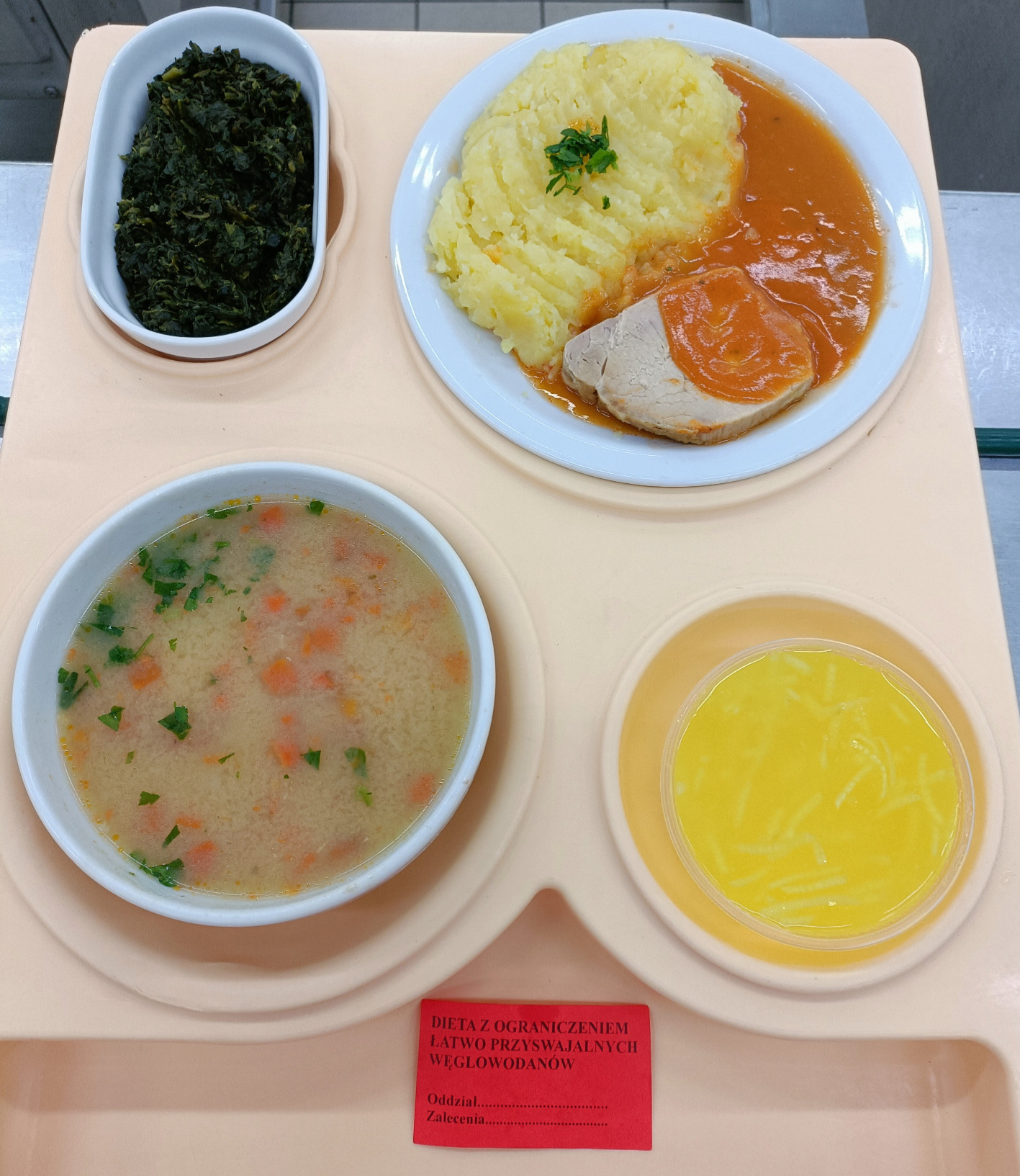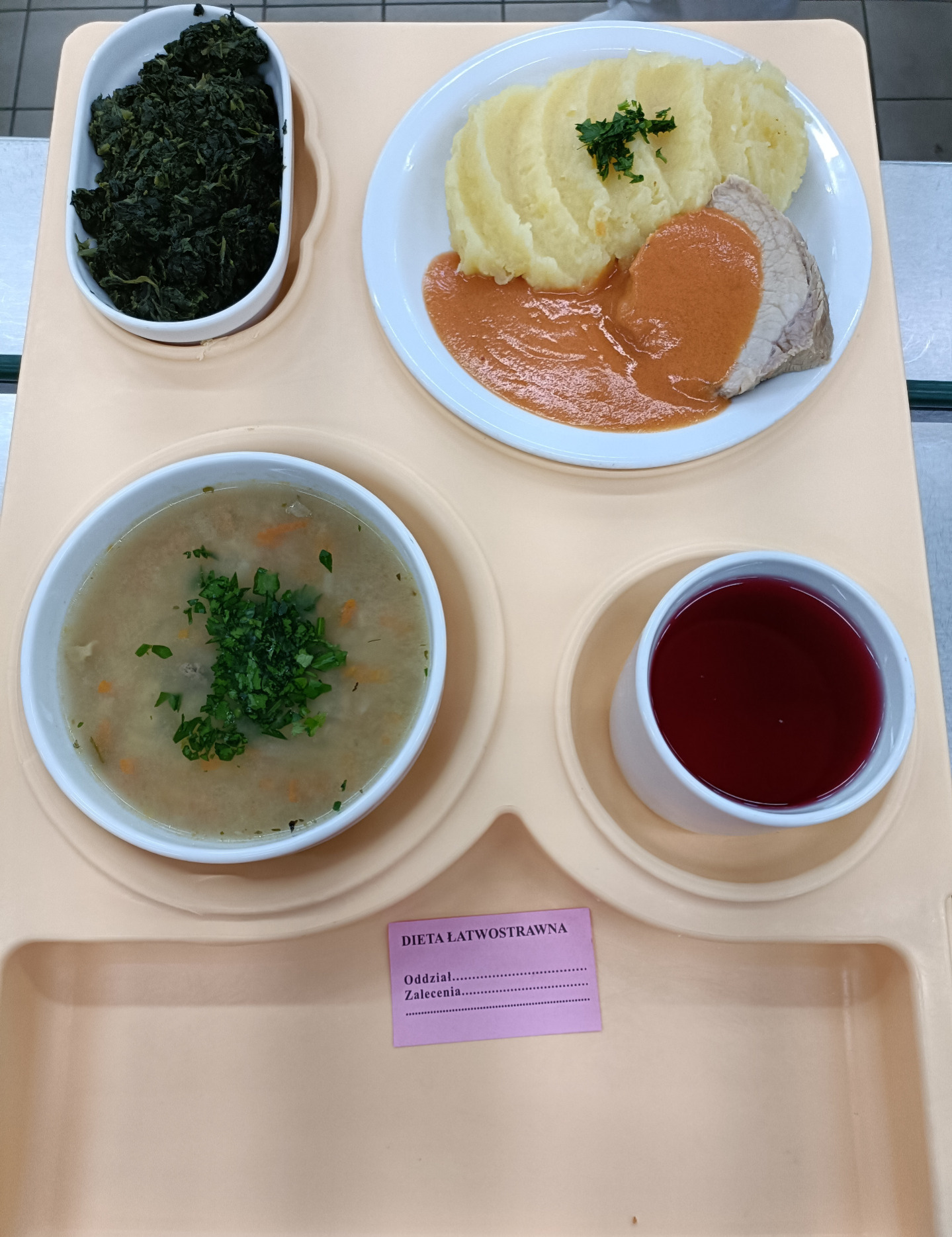 Barszcz gotowany z ziemniakami, dieta 300g schab gotowany 65g sos śmietanowy gotowany 80g szpinak mrożony gotowany 120g ziemniaki gotowane 200g napój owocowy gotowany 200ml |