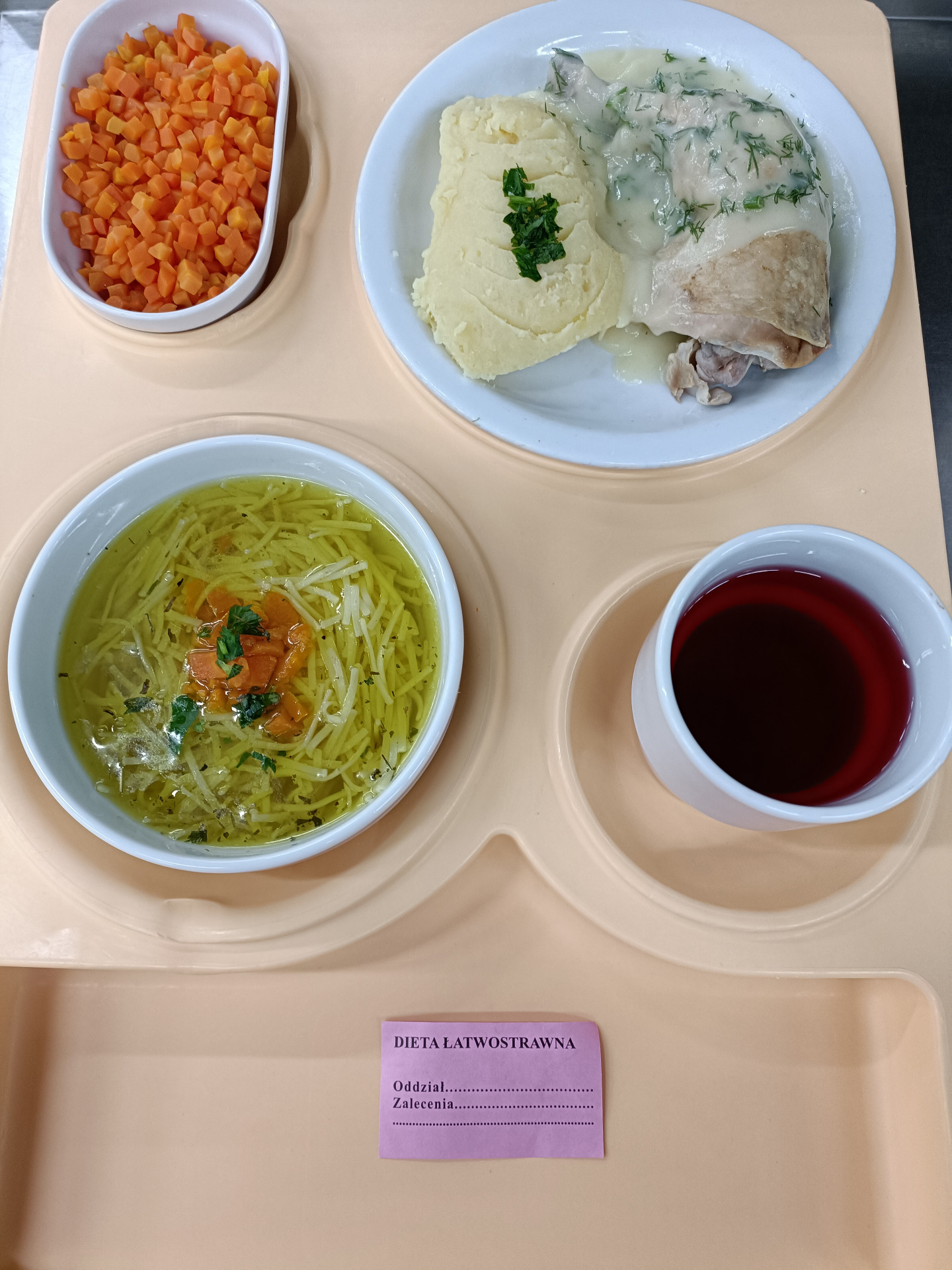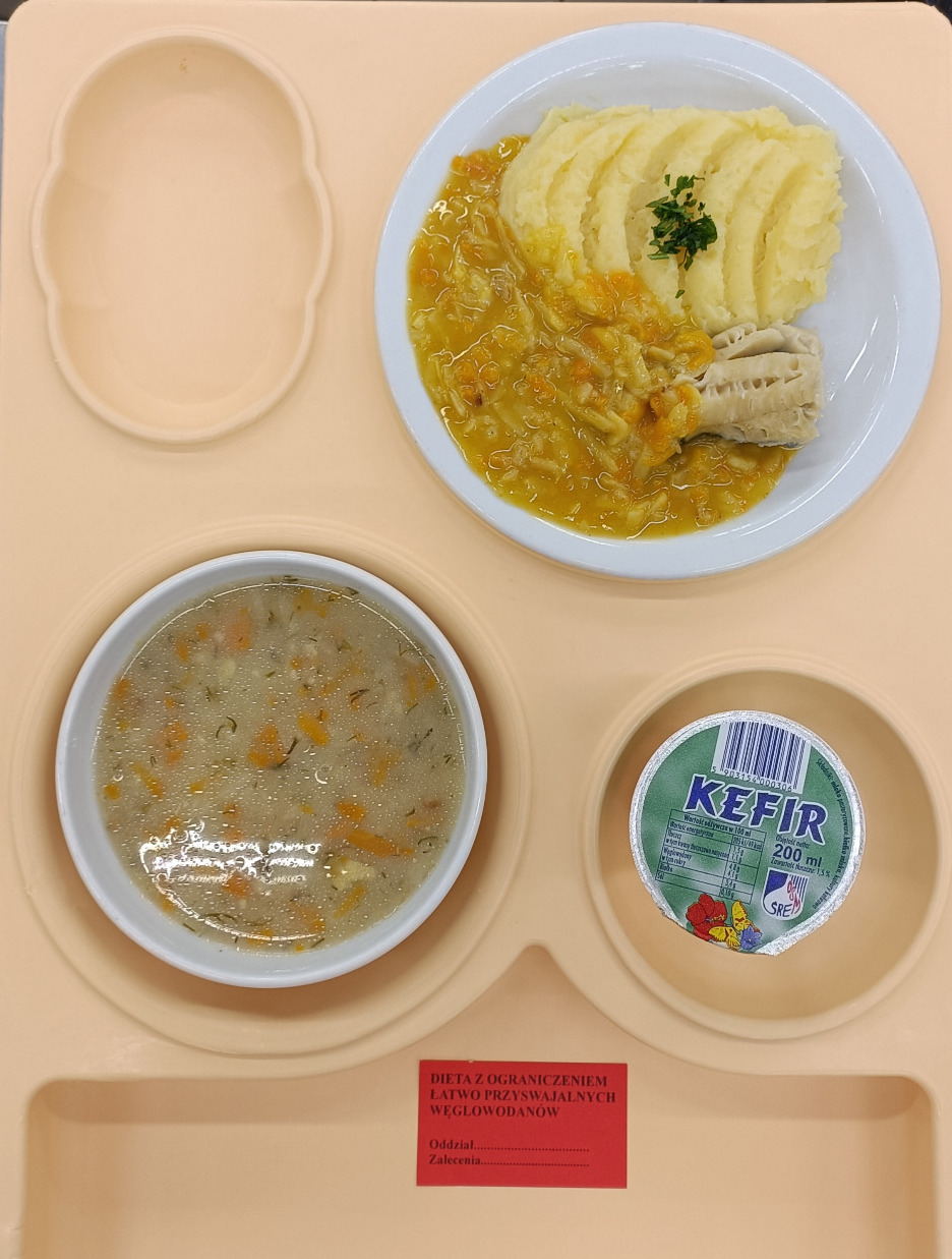 Zupa marchwiowa gotowana, dieta 300g ryba gotowana 65g sos pietruszkowy gotowany 80g szpinak mrożony gotowany 120g ziemniaki gotowane 200g napój owocowy gotowany 20ml |