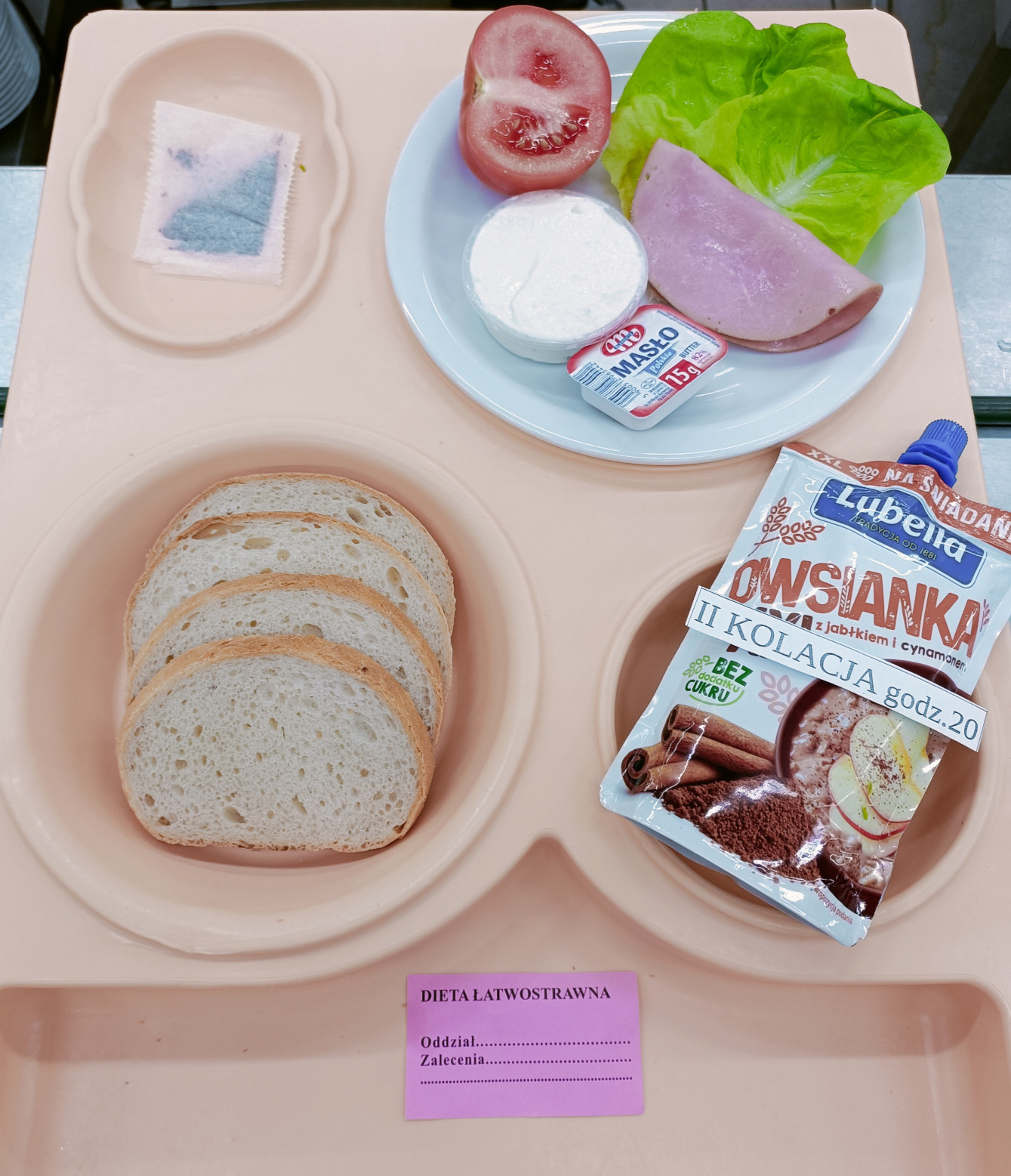 Herbata masło porcyjne 15g chleb pszenny 100g szynka delikatesowa 25g ser homo 50g pomidor 100g sałata 6g II kolacja- tubka owsiana 1szt-100g |