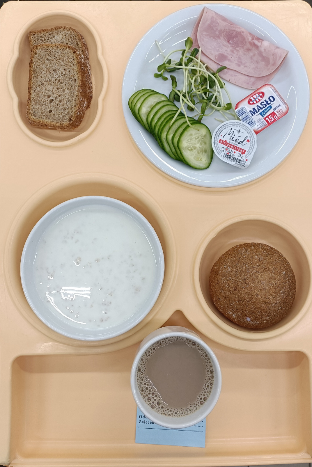 Zupa mleczna gotowana z ryżem 300g kawa zbożowa gotowana 200ml masło porcyjne 15g chleb razowy 70g chleb graham 60g szynka złota z indyka 50g ser tartar 20g kiełki 4g mix sałat 12g |
