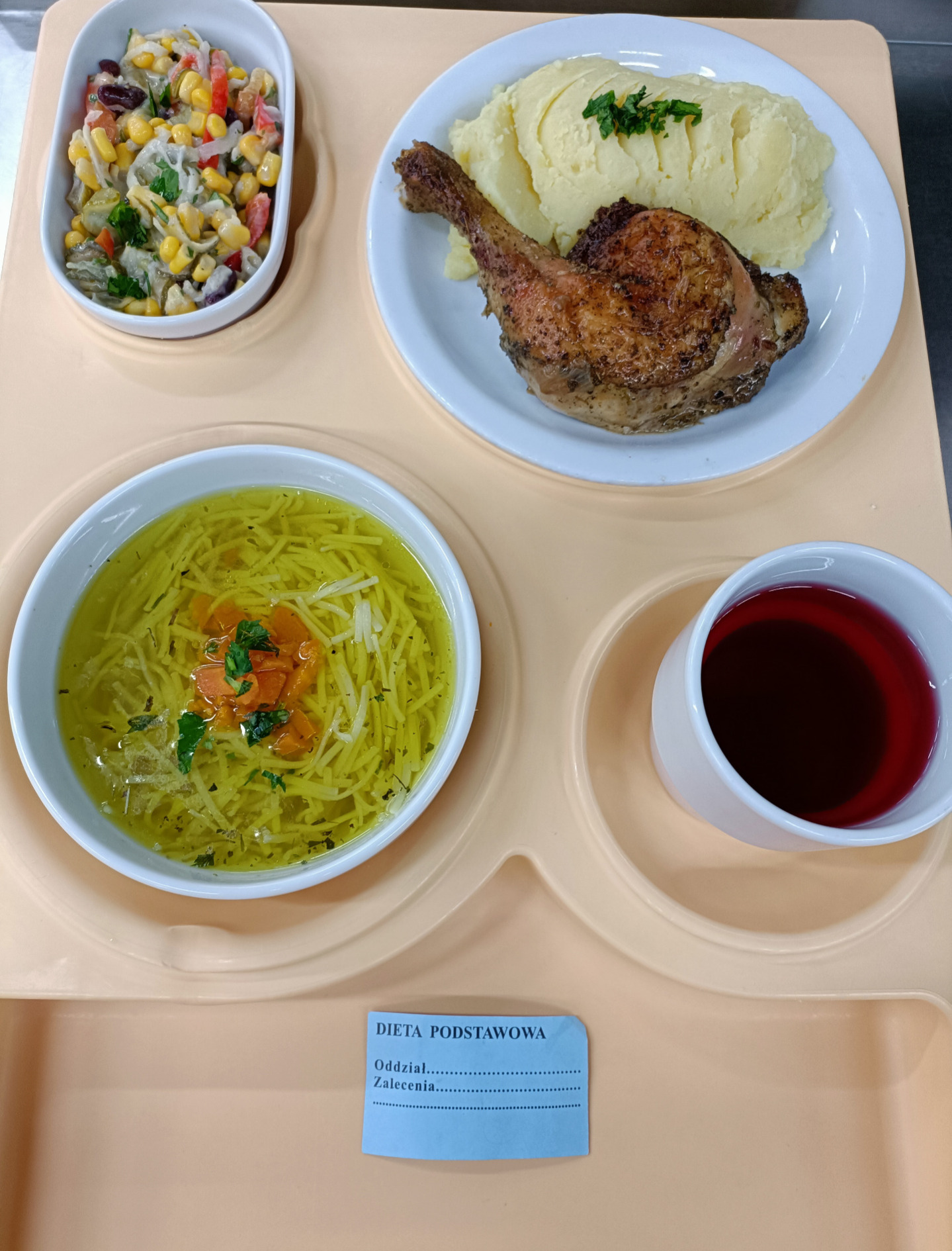 Barszcz gotowany z ziemniakami 300g kotlet mielony smażony 65g surówka z kapusty białej 120g ziemniaki gotowane 200g napój owocowy gotowany 200ml |
